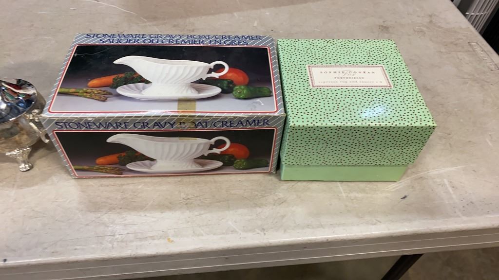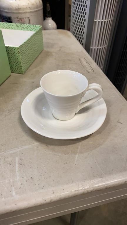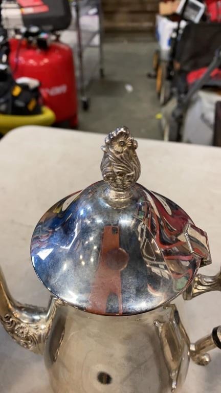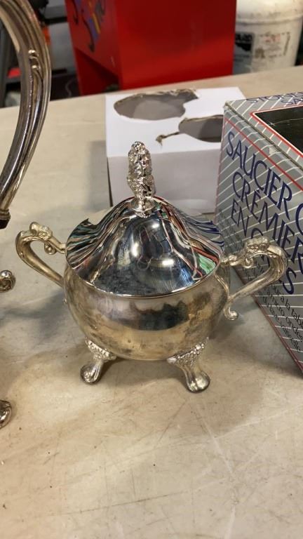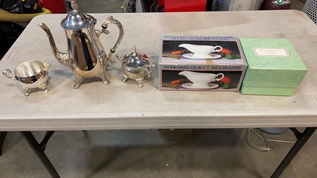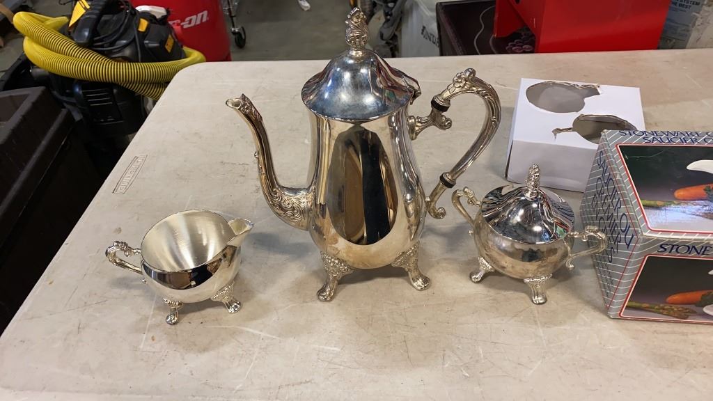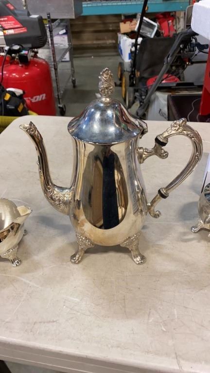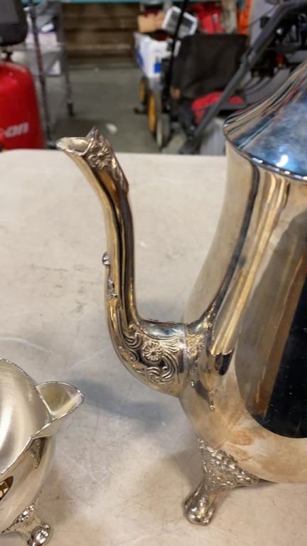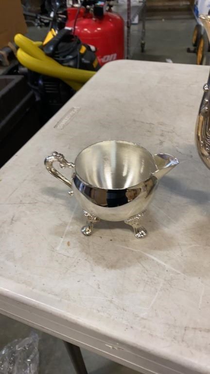 SILVER PLATE TEAPOT, CREAM AND SUGAR AND PORTMEIRION ESPRESSO CUP AND SAUCERS