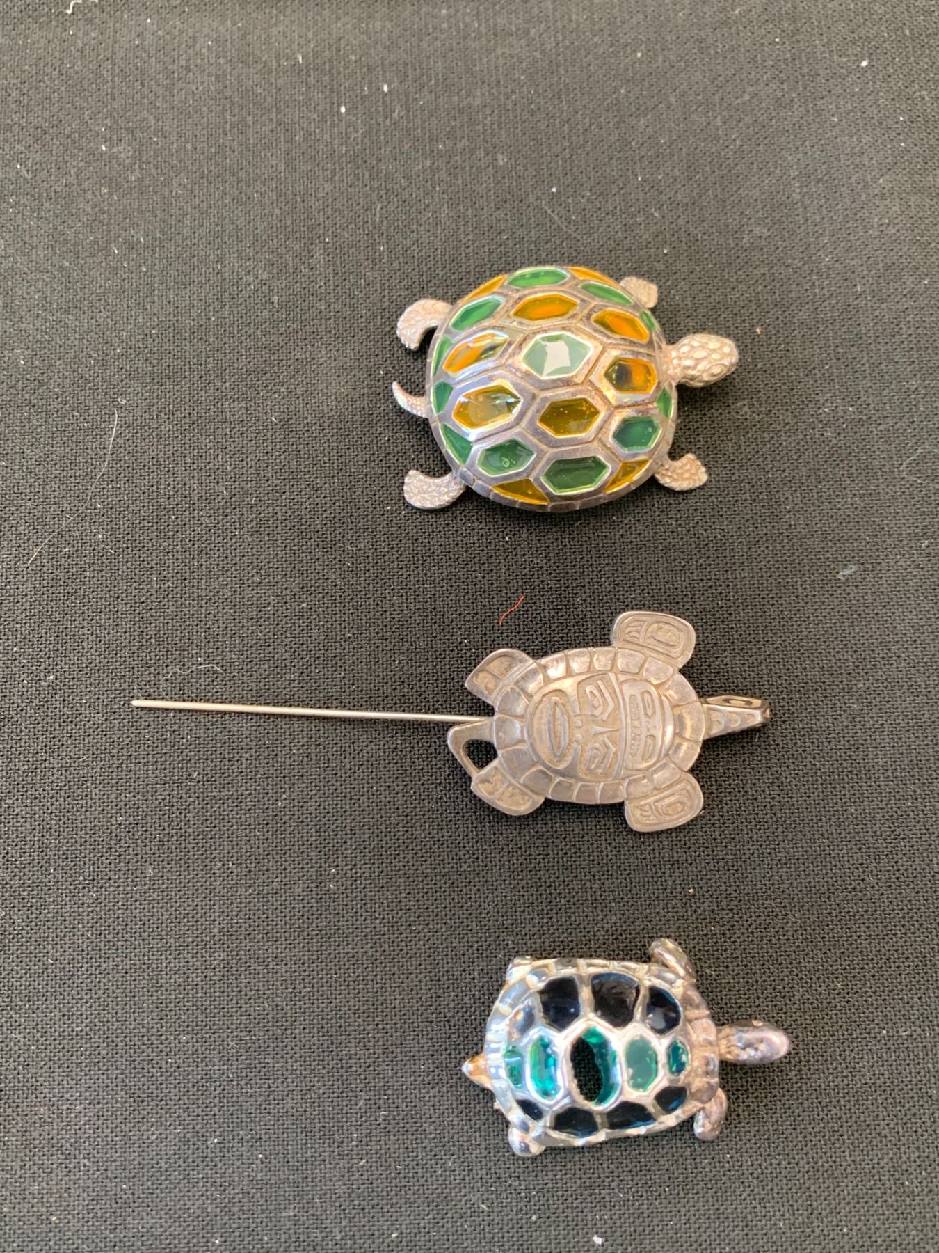 SILVER TURTLE PIN AND 2 SILVER AND GLASS TURTLE PIECES