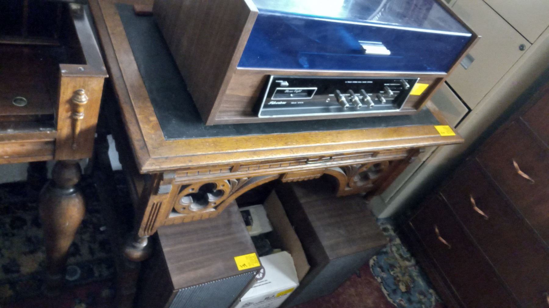 SILVERTONE STEREO UNIT W/TURNTABLE & 8 TRACK, SPEAKERS & BOX OF 8 TRACK TAPES