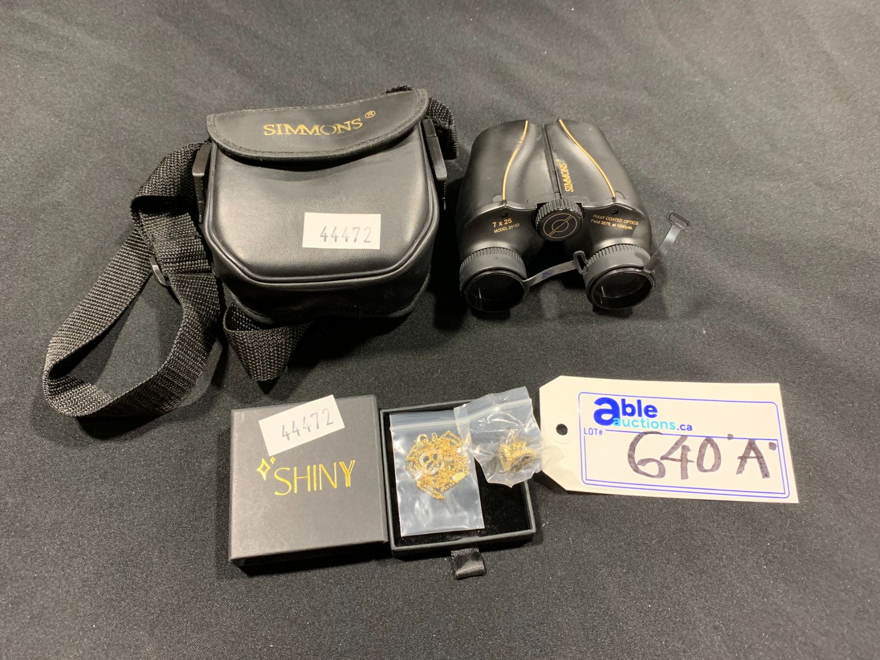 SIMMONS 24153 7X 25 ANGLE BINOCULAR, SHINY GOLD PLATED EAR RINGS & CHAIN WITH LOCKET
