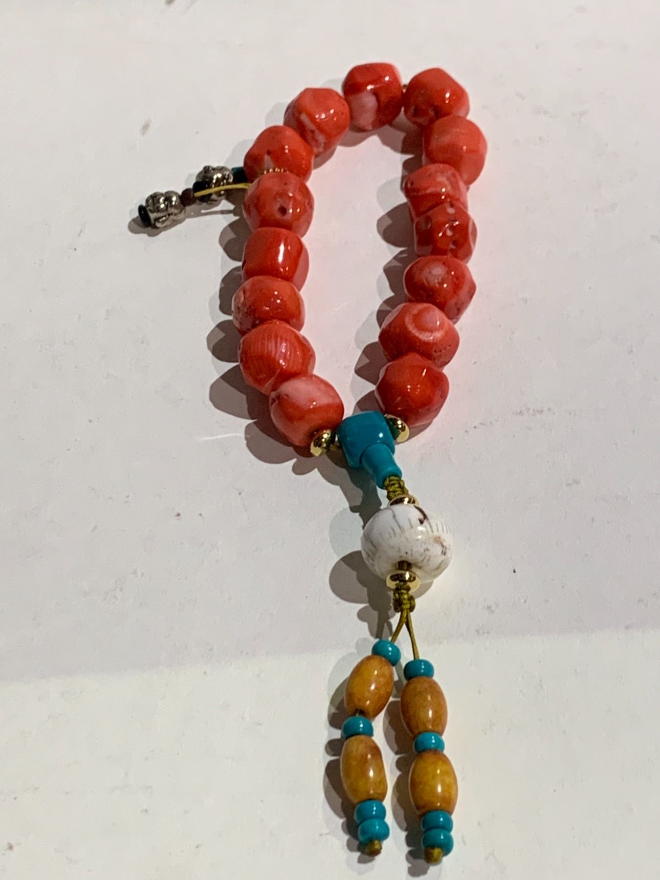 SINO-TIBETAN RED CORAL BEADS BRACELET WITH CONCH SHELL BEAD PENDANT