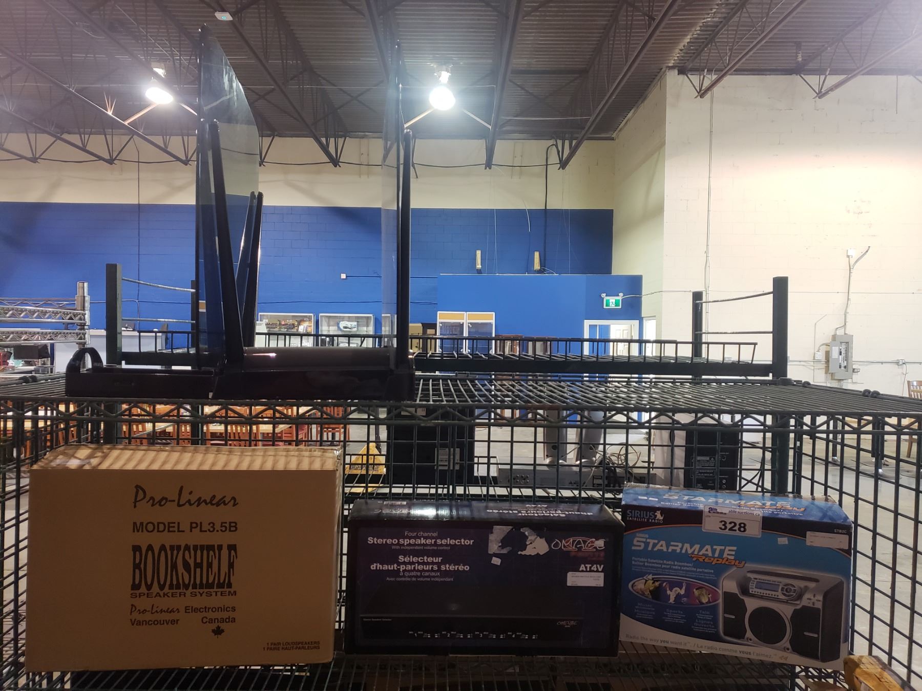 SIRIUS SATELLITE RADIO STARMATE REPLAY PORTABLE RADIO BOOMBOX, FOUR CHANNEL STEREO SPEAKER SELECTOR, PRO-LINEAR BOOKSHELF SPEAKER SYSTEM MODEL PL3.5B, & GLASS MOUNT