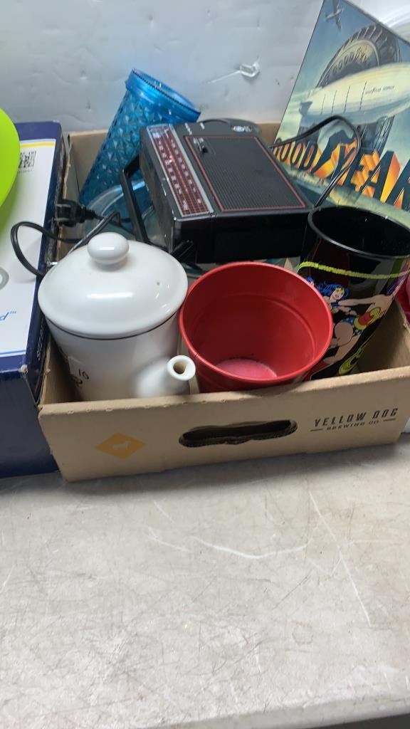 SITZ BATH WITH COOKWARE AND 2 TRAYS OF KITCHEN ITEMS