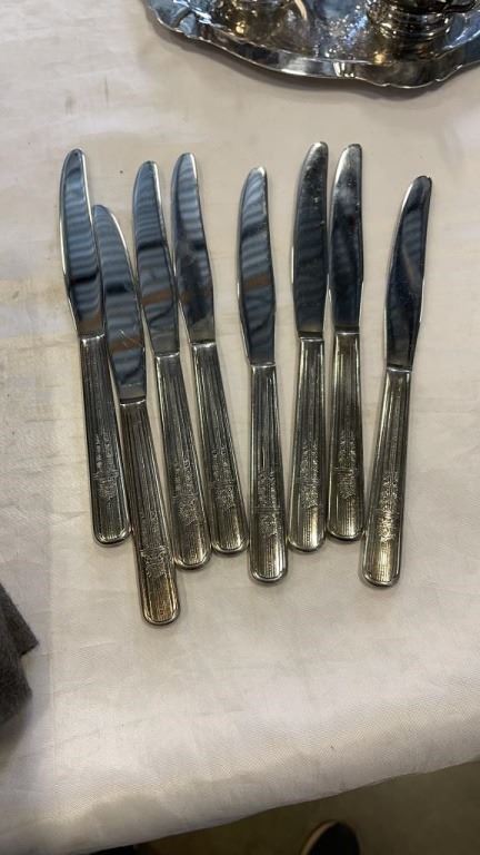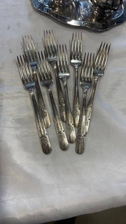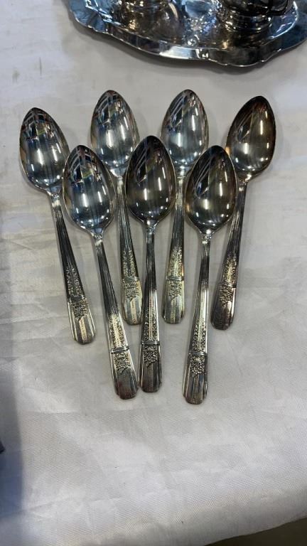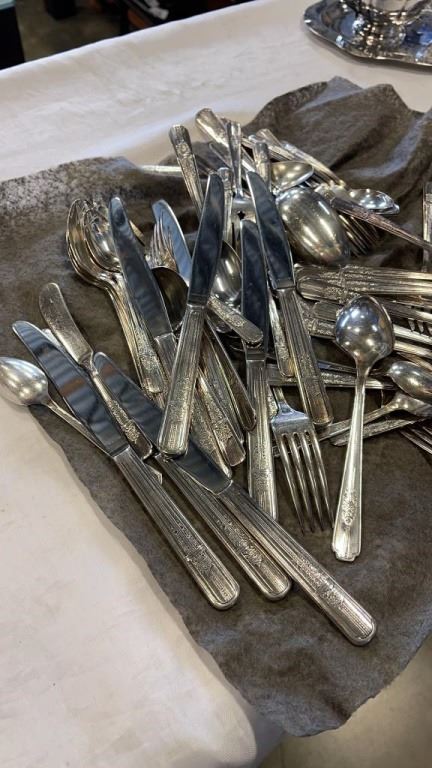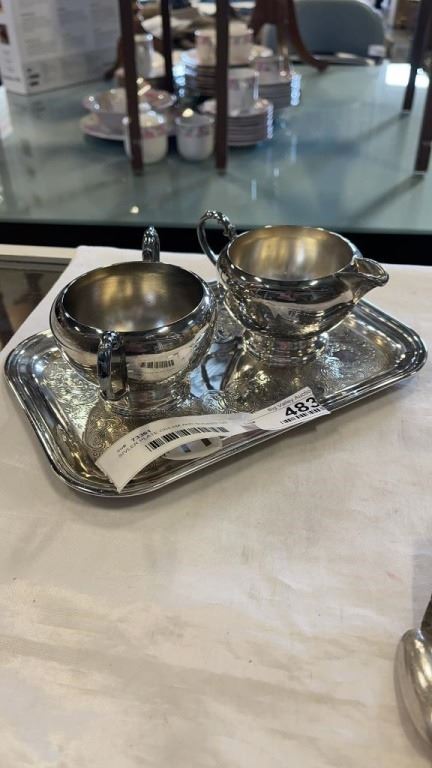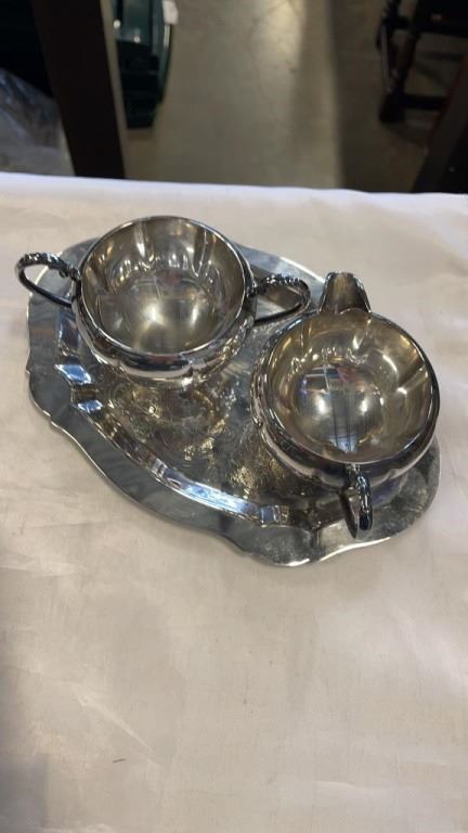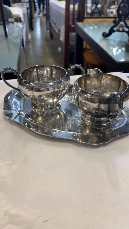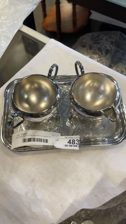 SIVLER PLATE CREAM AND SUGARS ON PLATTERS AND PLATED CUTLERY
