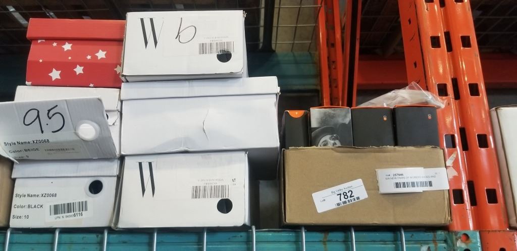 SIX NEW PAIRS OF WOMEN'S SHOES AND BOX OF ASSORTED NEW BLUE LIGHT GLASSES