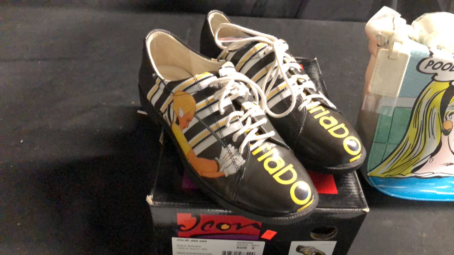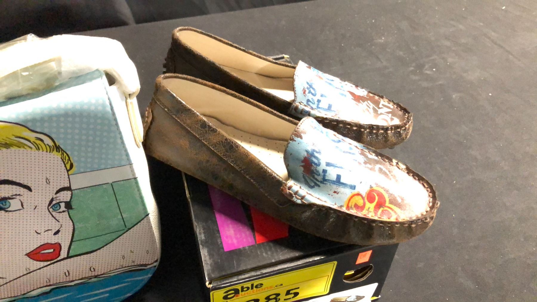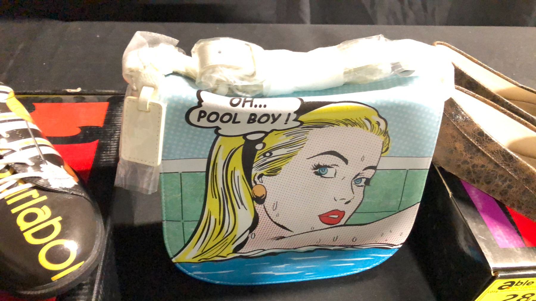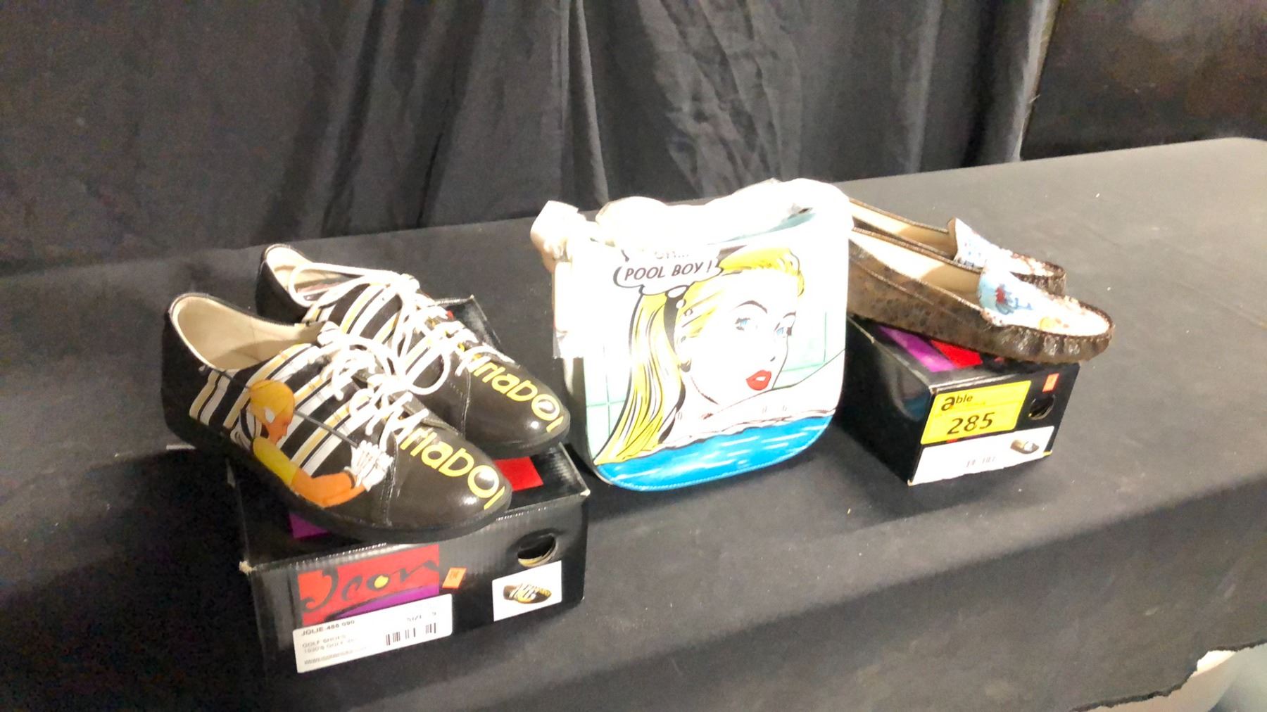 SIZE 9 1930S GOLF SHOES, EVERYDAY SORCERY DRIVING MOCCASINS, "OH POOL BOY" PURSE