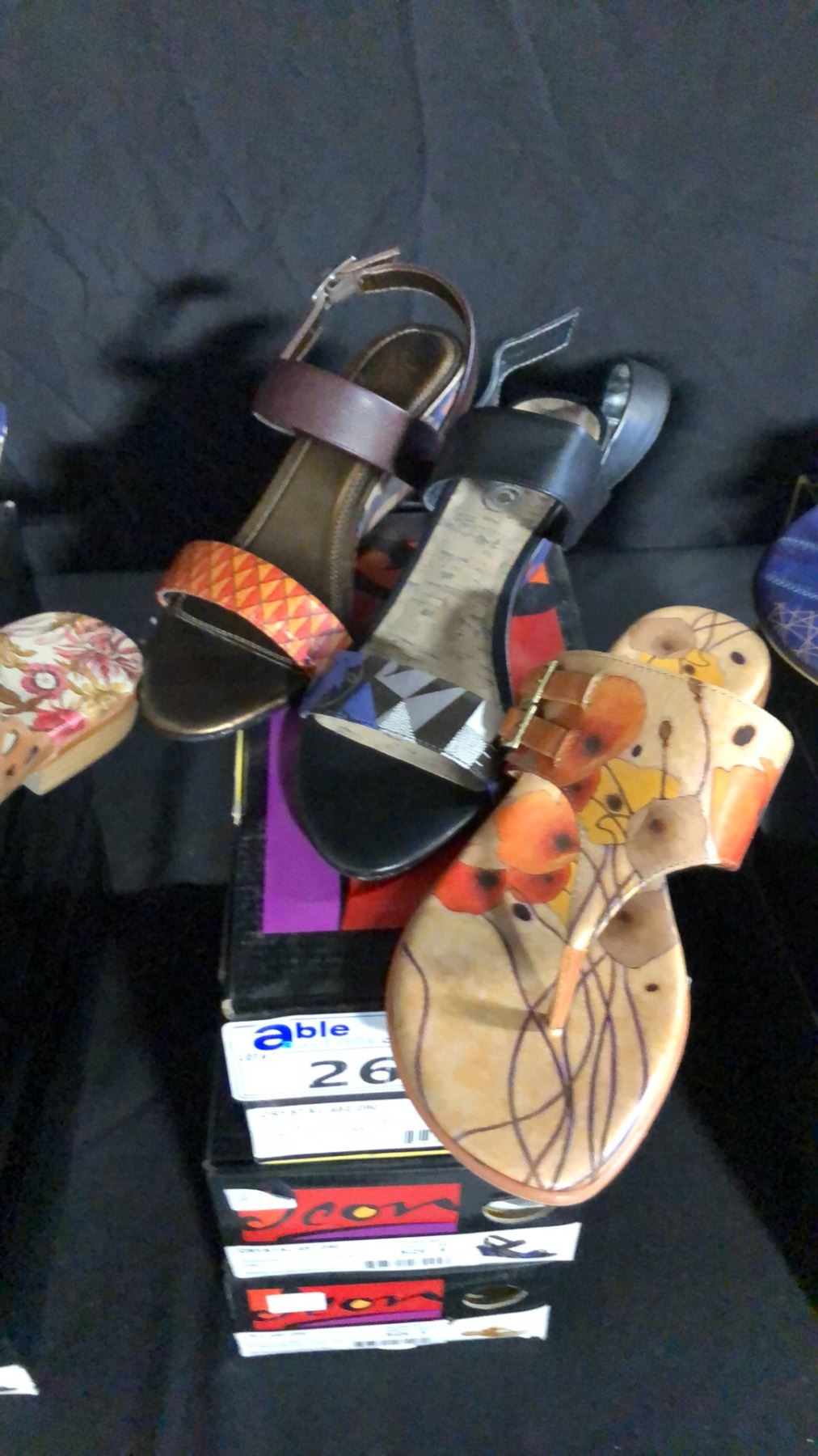 SIZE 9 3 MUSICIANS COVERED WEDGE SANDALS, ABSTRACT COVERED WEDGE SANDALS, PUMPKIN POPPIES FLAT THONG WITH BUCKLE