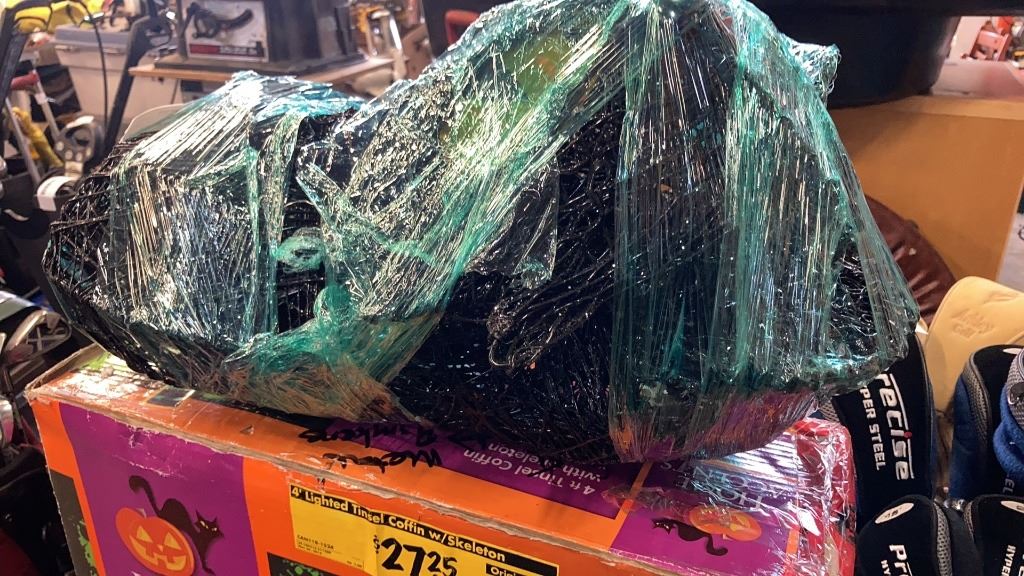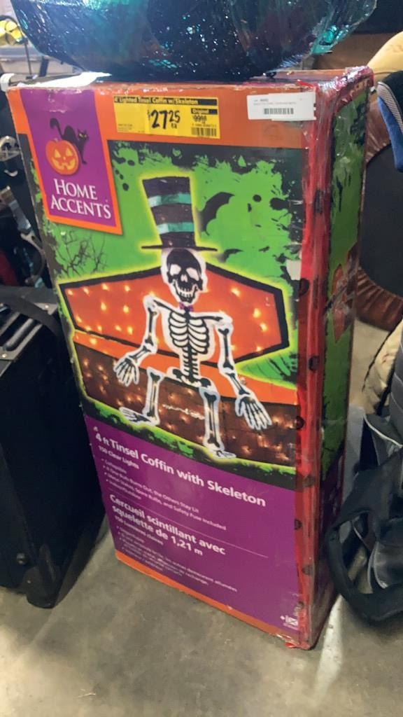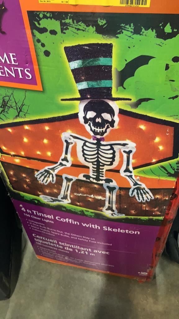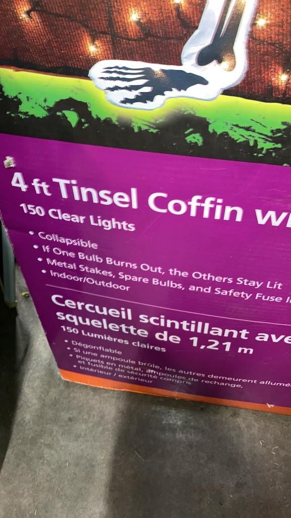 SKELETON TINSEL COFFIN AND METAL BLACK CAT DISPLAY