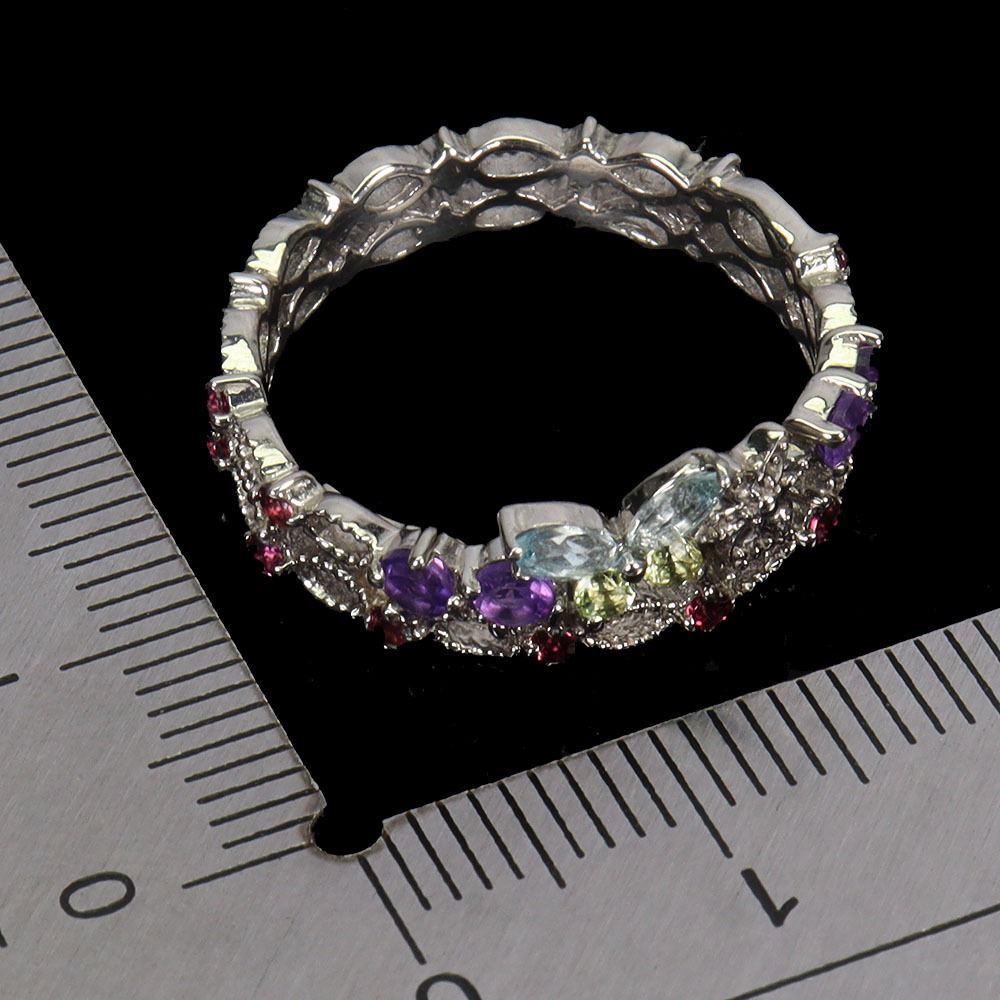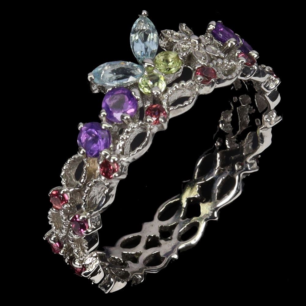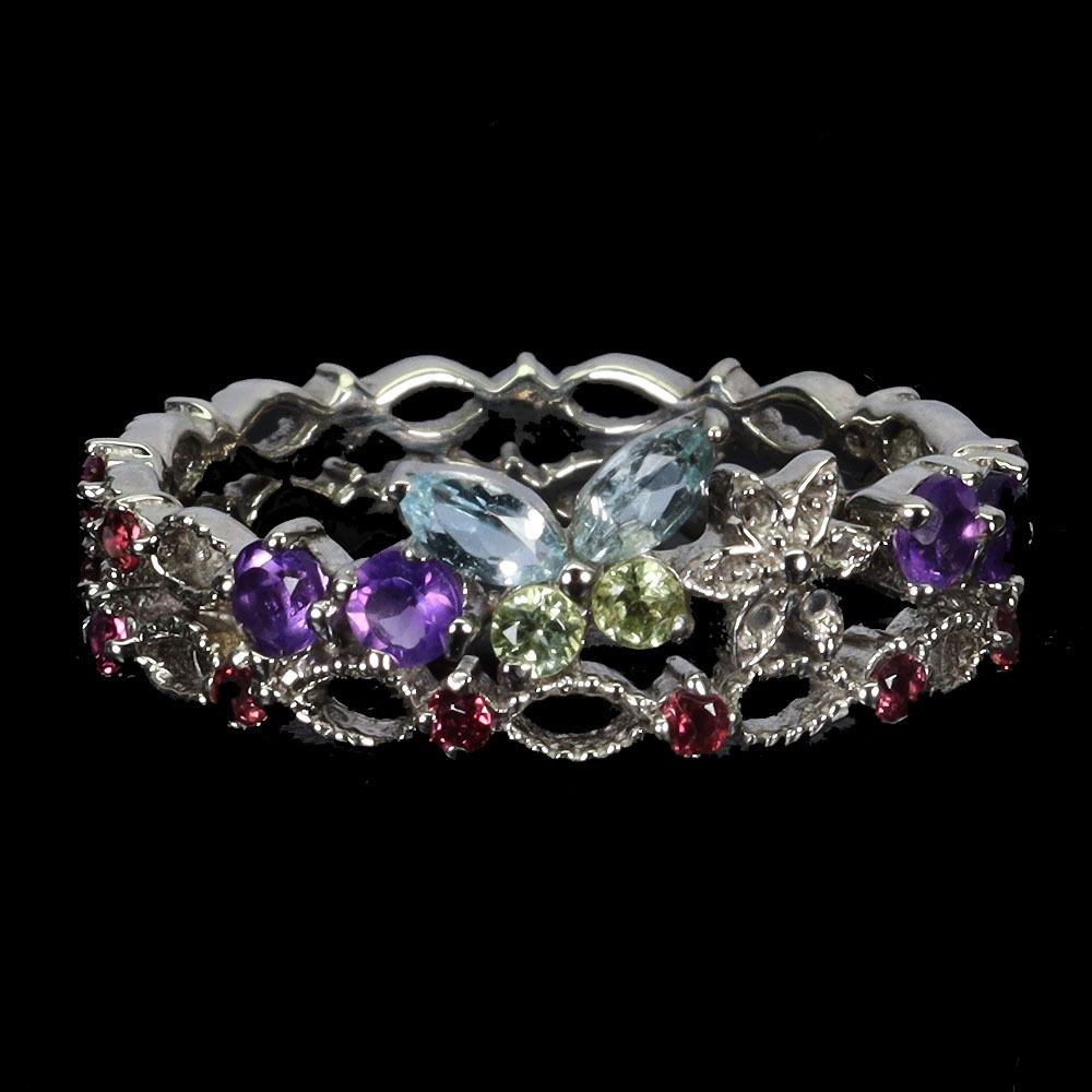 SKY BLUE TOPAZ, AMETHYST, PERIDOT, RHODOLITE GARNET RING IN 14K WHITE PLATED GOLD OVER 925 STERLING