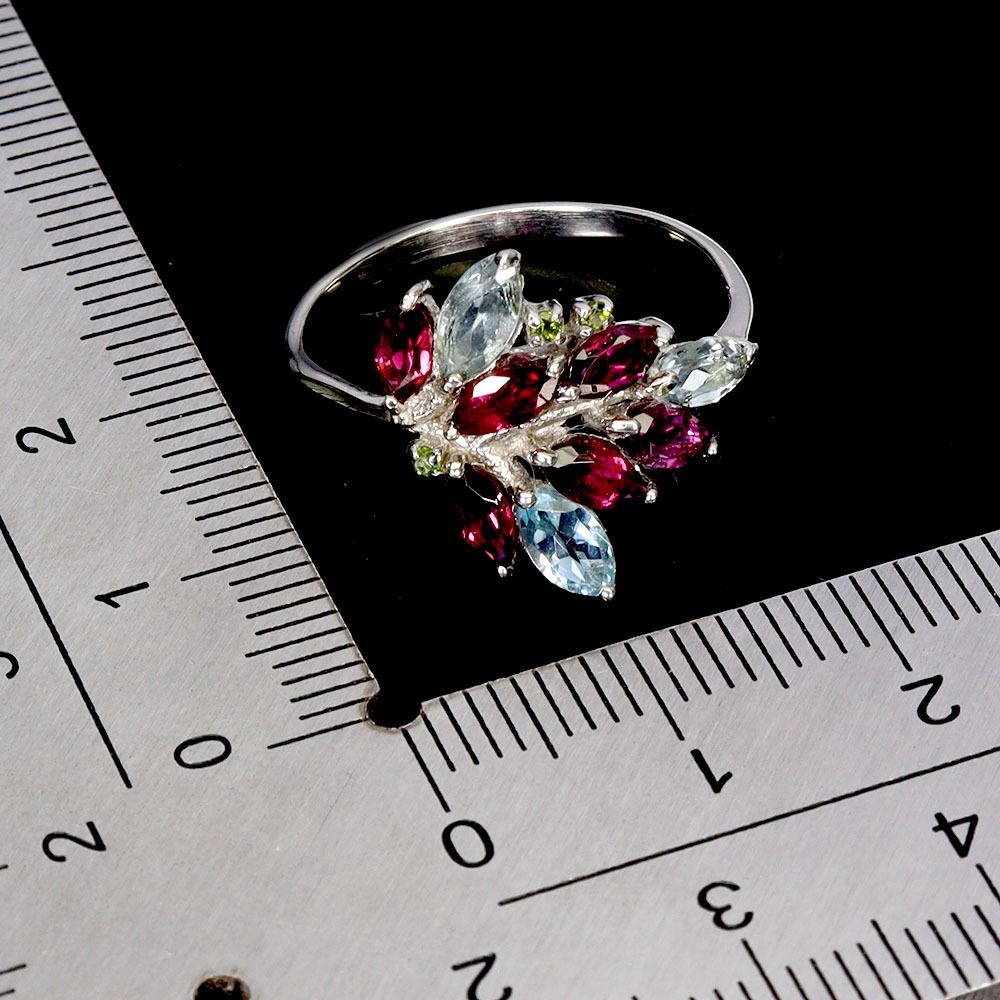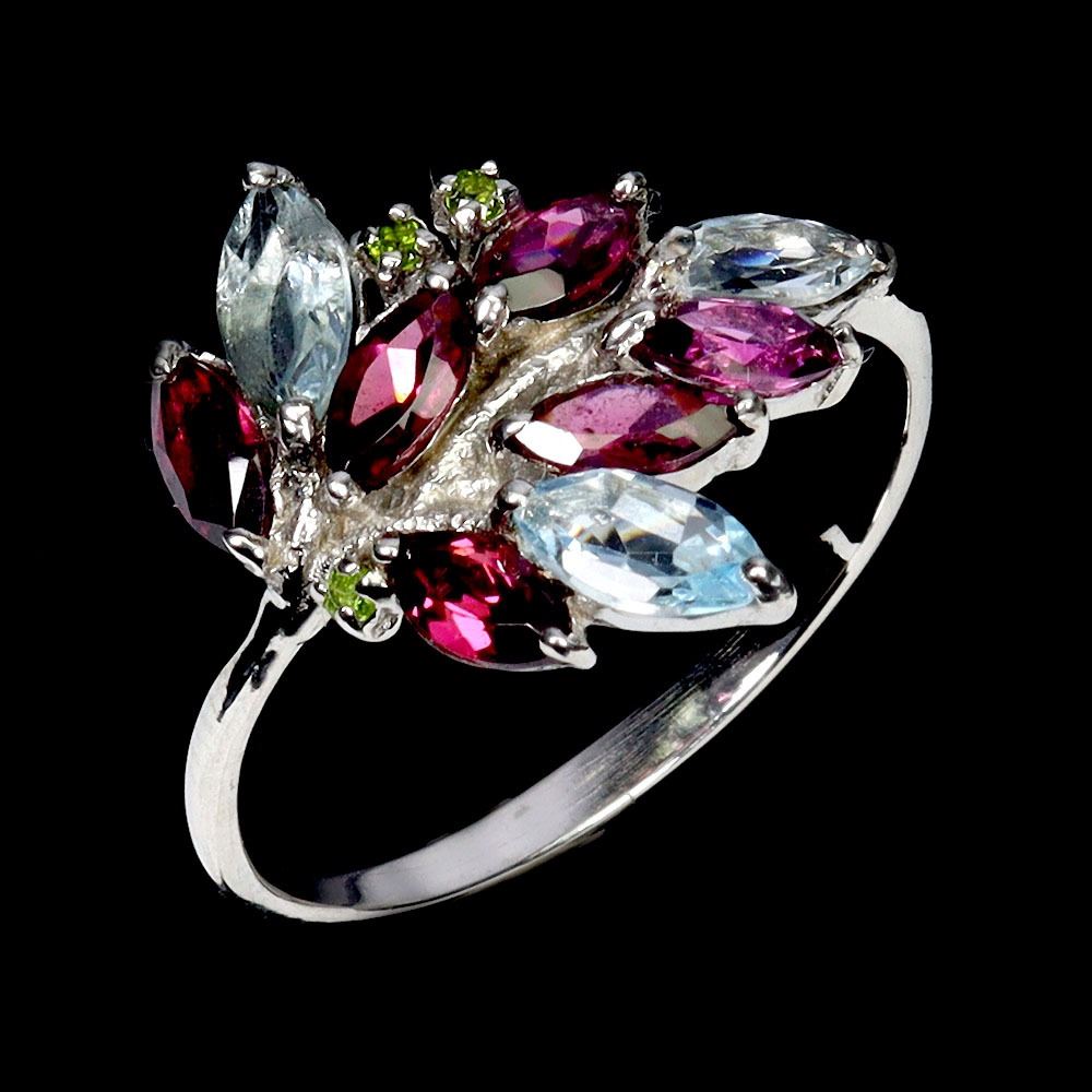 SKY BLUE TOPAZ, RHODOLITE GARNET AND CHROME DIOPSIDE RING IN 14K WHITE PLATED GOLD OVER 925 STERLING