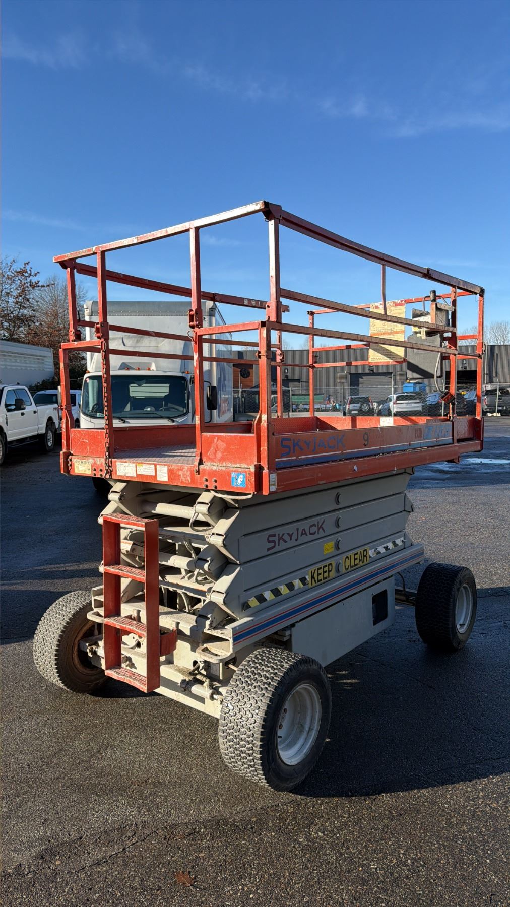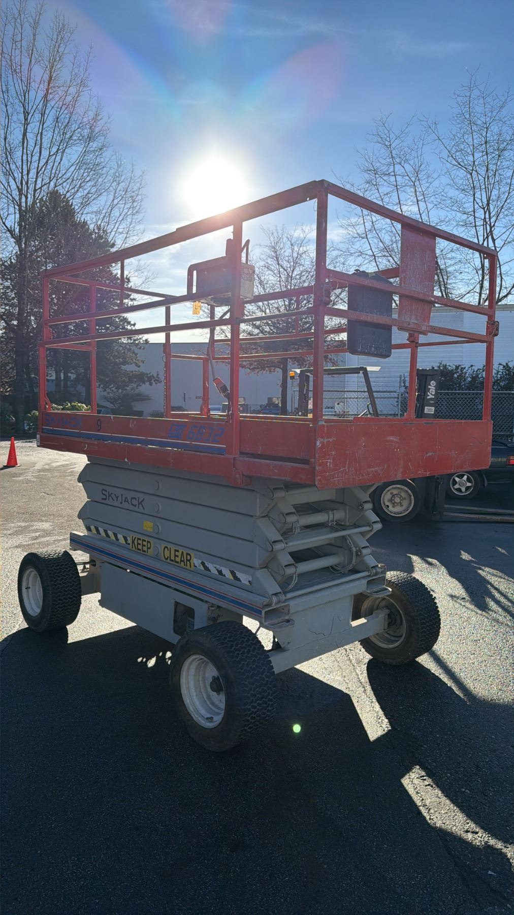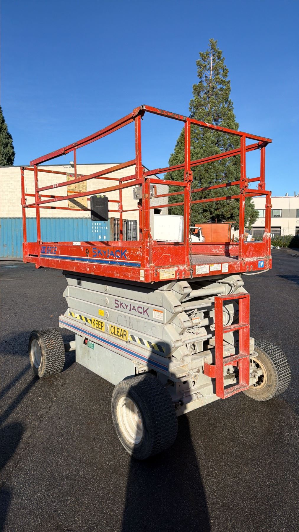 SKYJACK SJ 111-6832 ORANGE 32" X 68" INDUSTRIAL 1000 LBS CAPACITY ELECTRIC MAN LIFT WITH EXTENSION BED 5610 LBS VEHICLE WEIGHT, BUILT IN 110V CHARGER, PNEUMATIC TIRES, HAS KEYS & HAND CONTROL UNIT