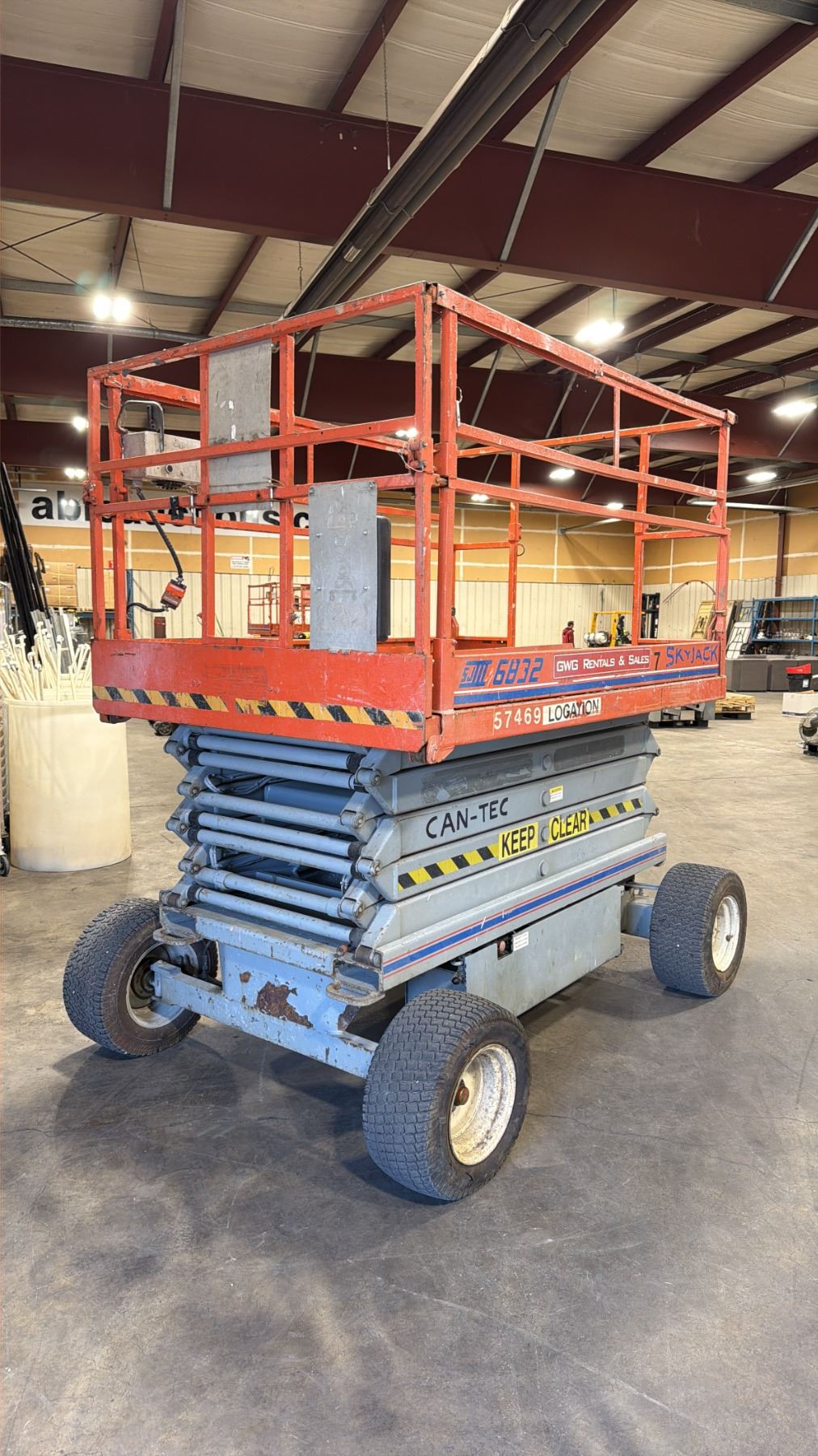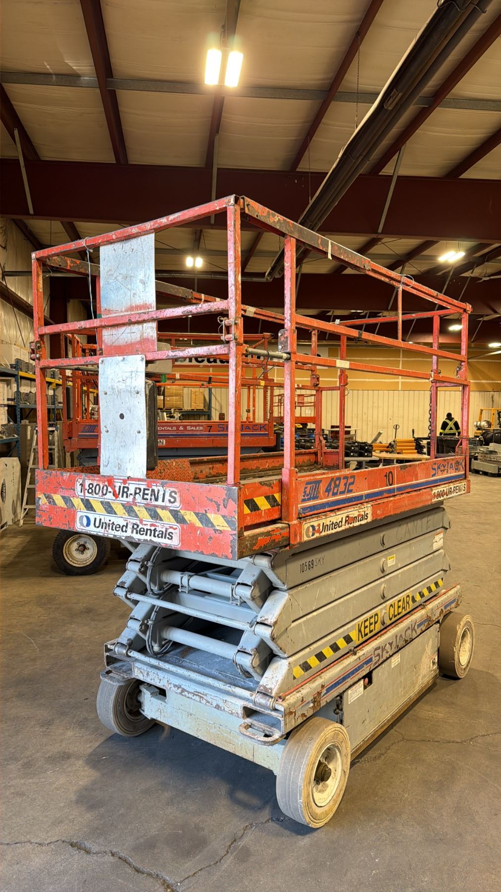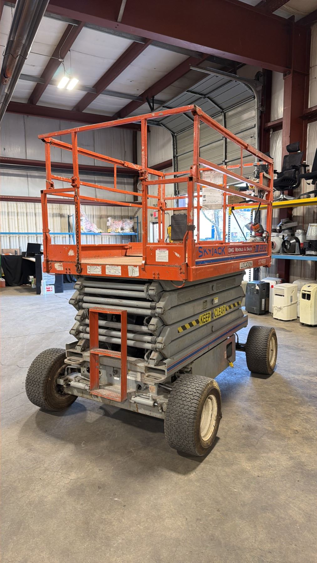 SKYJACK SJ 111-6832 ORANGE 32" X 68" INDUSTRIAL 1000 LBS CAPACITY ELECTRIC MAN LIFT WITH EXTENSION BED 5610 LBS VEHICLE WEIGHT, BUILT IN 110V CHARGER, PNEUMATIC TIRES, HAS KEYS & HAND CONTROL UNIT