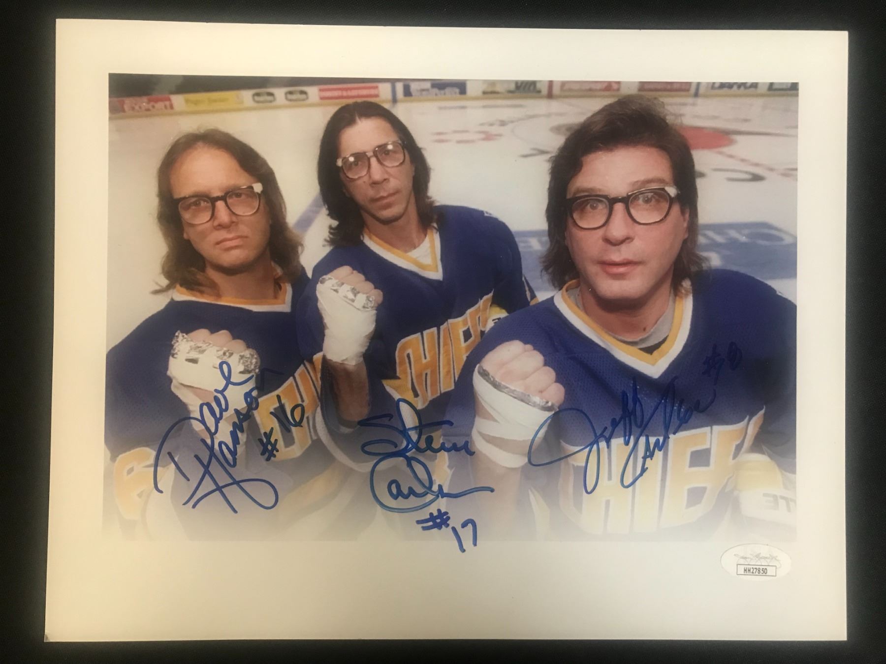 SLAPSHOT THE HANSON BROTHERS TRIPLE SIGNED 8 X 10 (JSA COA)