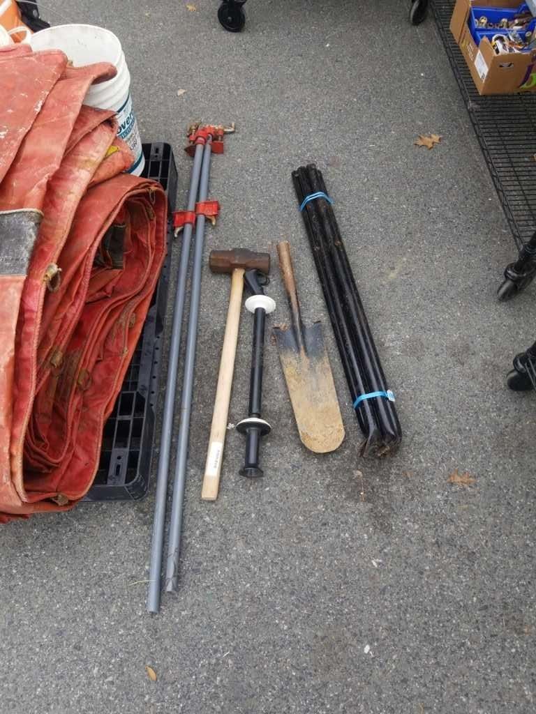 SLEDGEHAMMER, WRAP TOOL, SHOVEL HEAD, AND PIPE CLAMPS