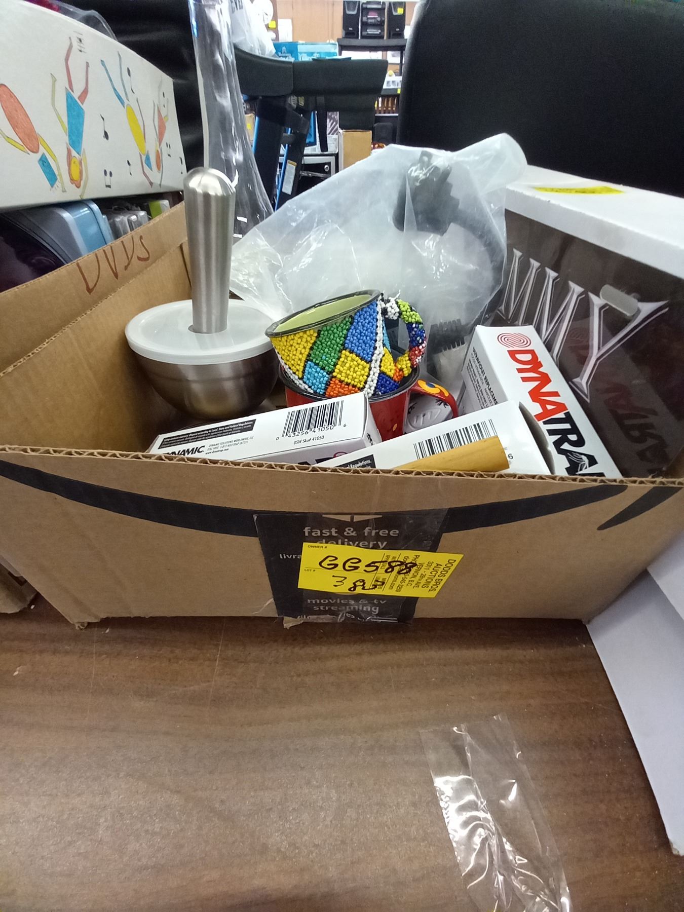 SMALL BOX OF METAL MORTAR PESTALS, SMALL LANTERN, AND CUPS