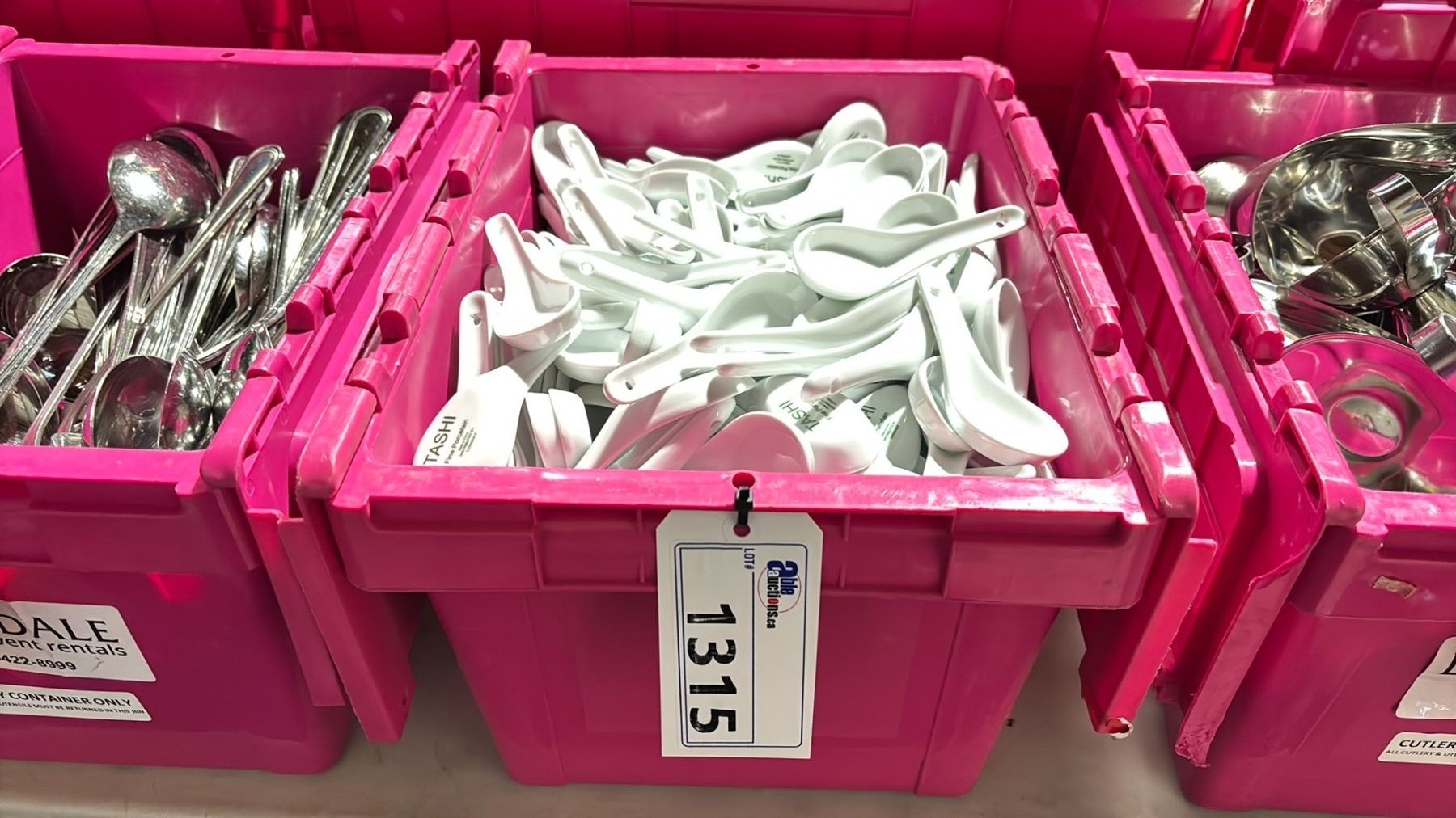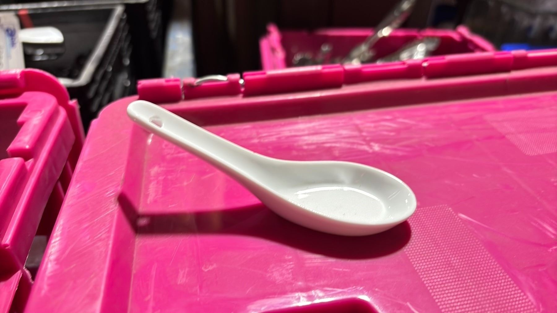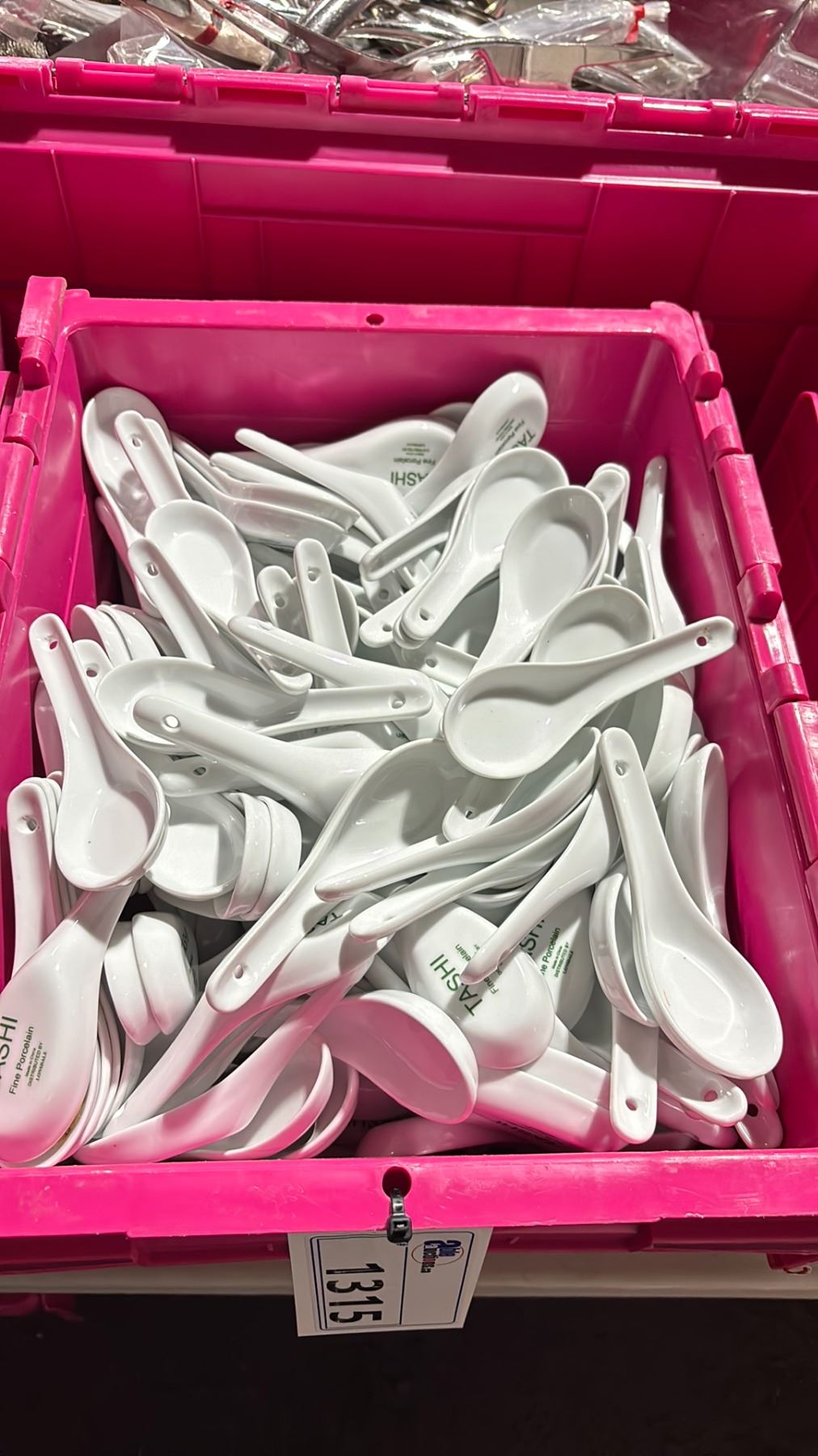 SMALL FOLD TOP BIN OF COMMERCIAL RESTAURANT WHITE SOUP SPOONS *BIN INCLUDED*