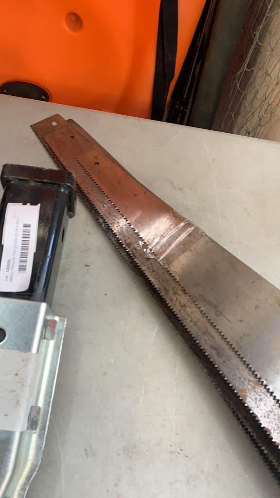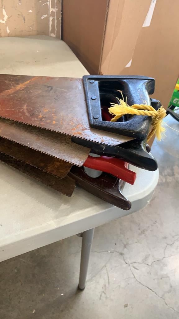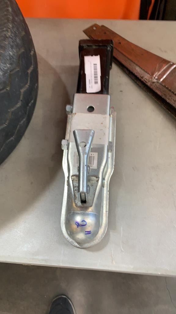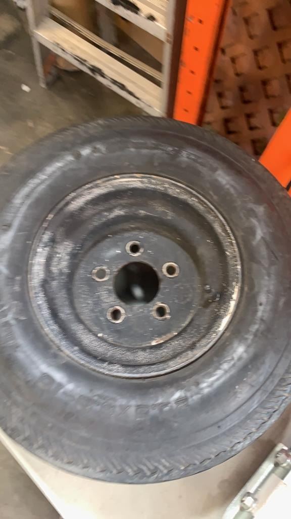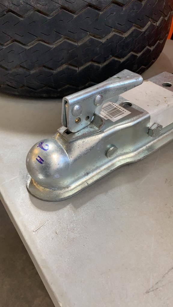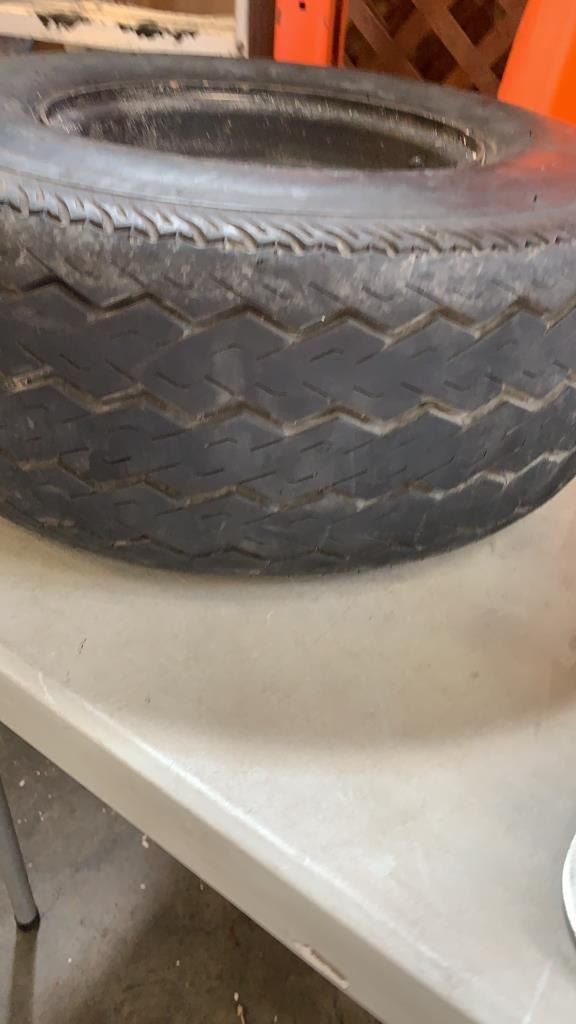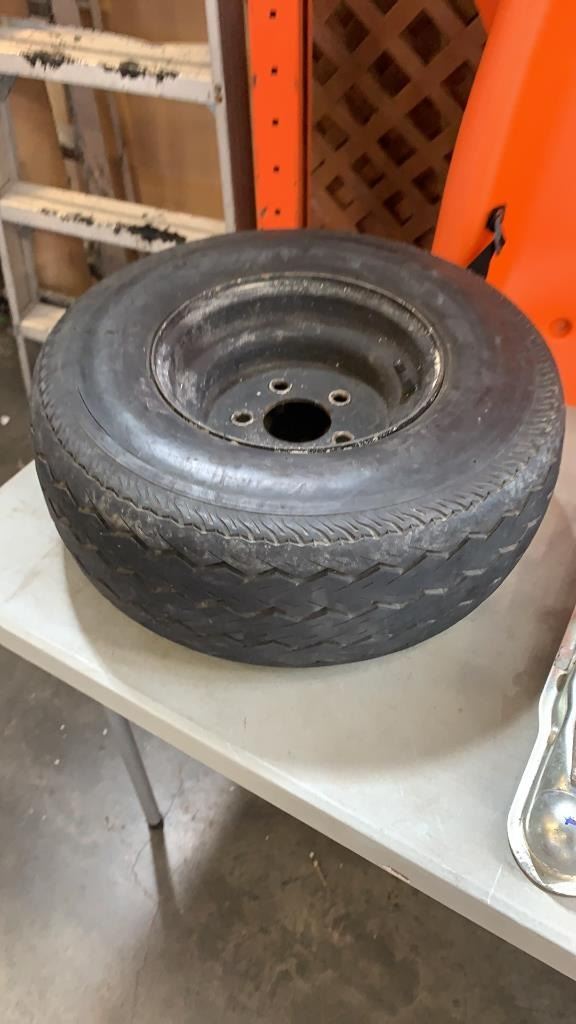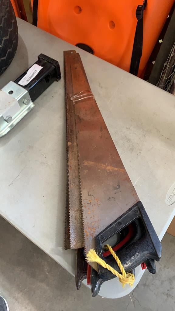 SMALL TRAILER TIRE 20.5X8-10 ON 5 BOLT RIM, HITCH AND HANDSAWS