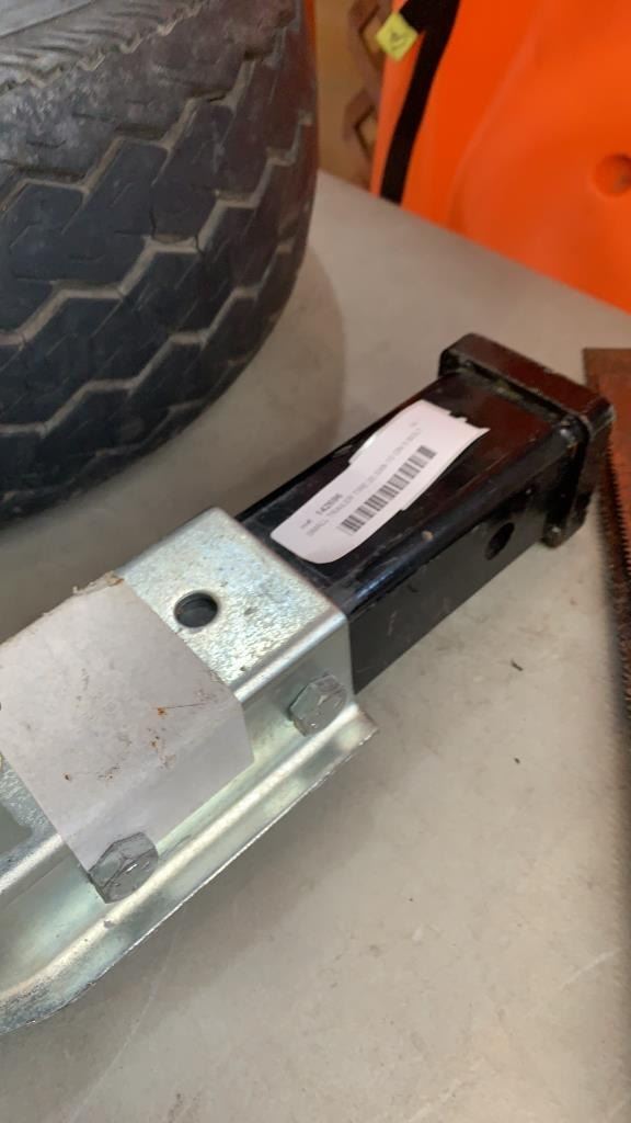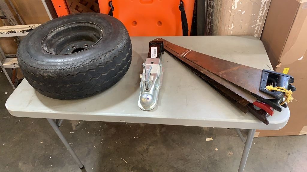 SMALL TRAILER TIRE 20.5X8-10 ON 5 BOLT RIM, HITCH AND HANDSAWS