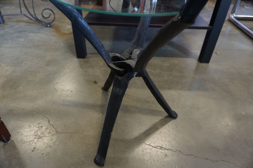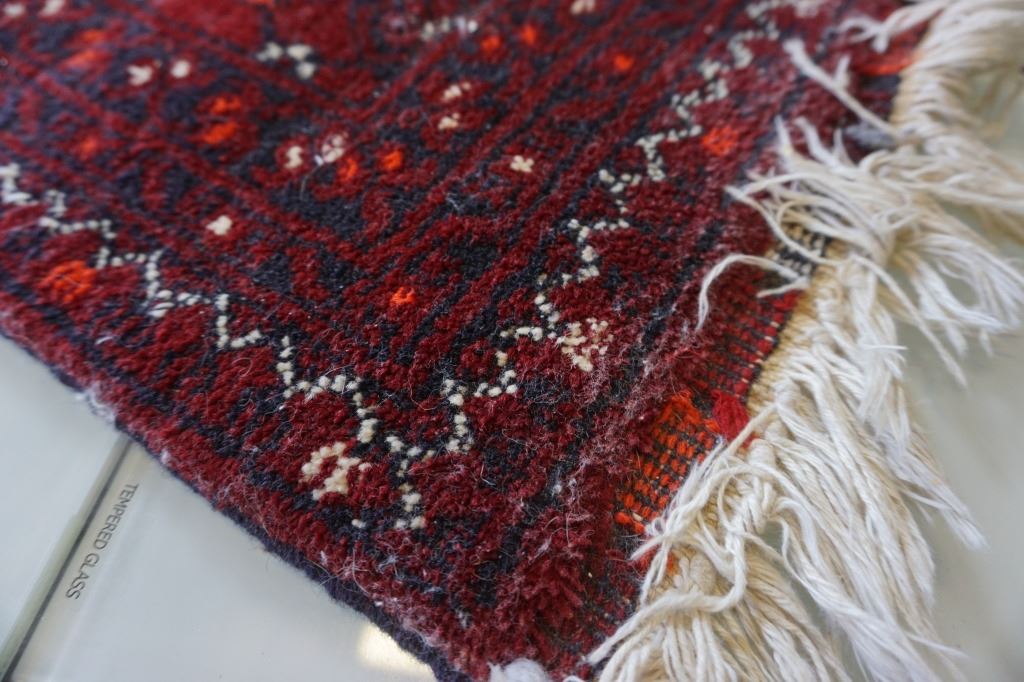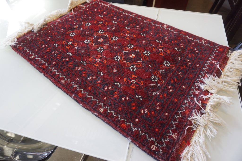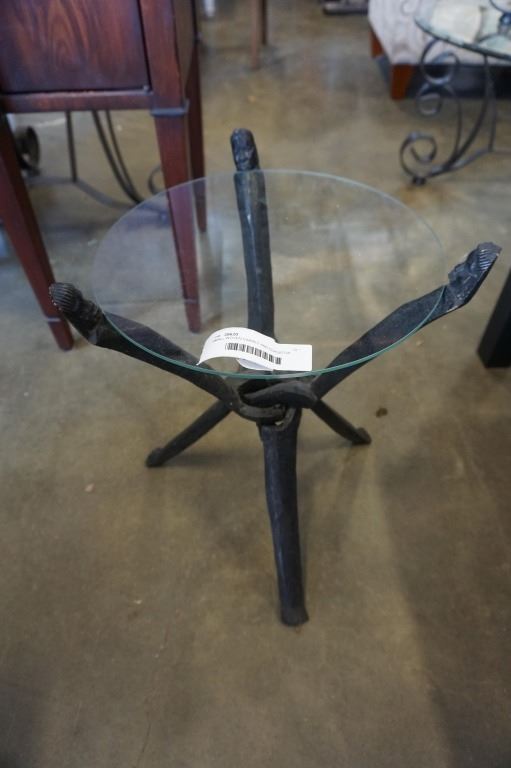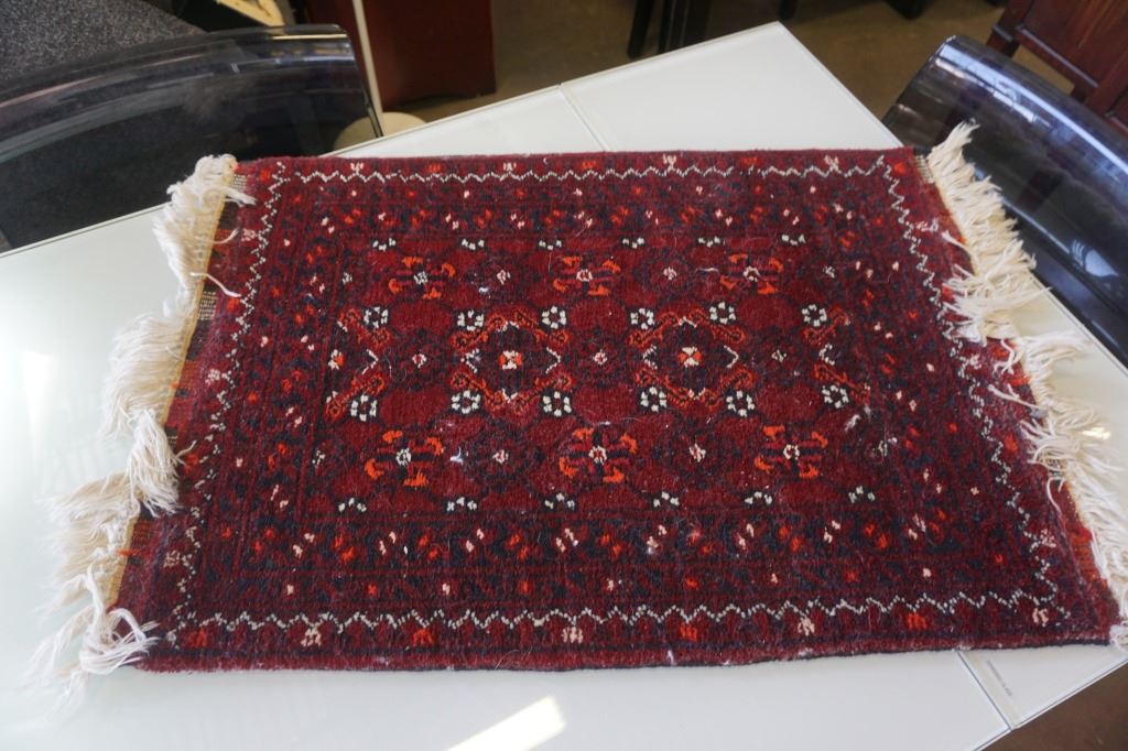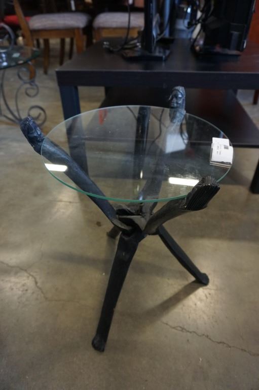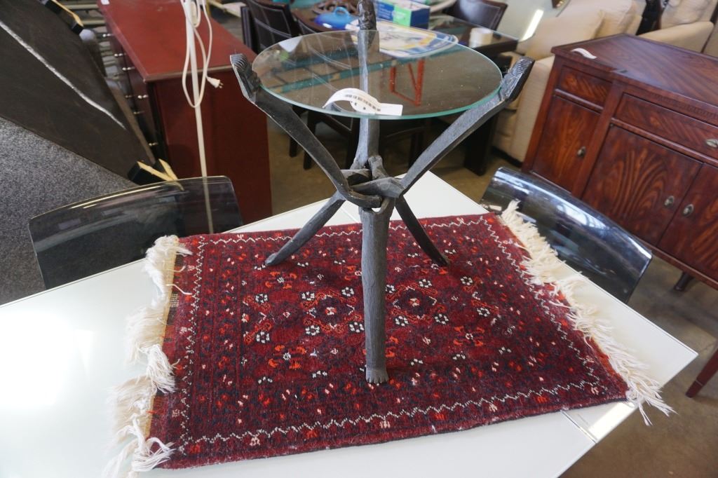 SMALL WOVEN CARPET AND GLASSTOP CARVED WOOD ENDTABLE