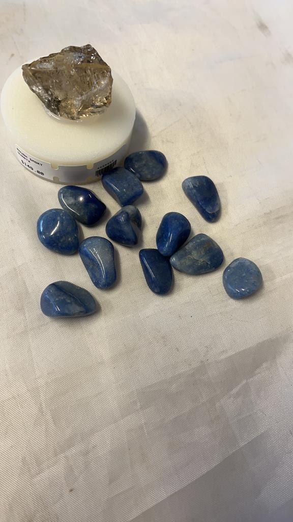 SMOKEY QUARTZ DISPLAY WITH BLUE QUARTZ TUMBLED STONES