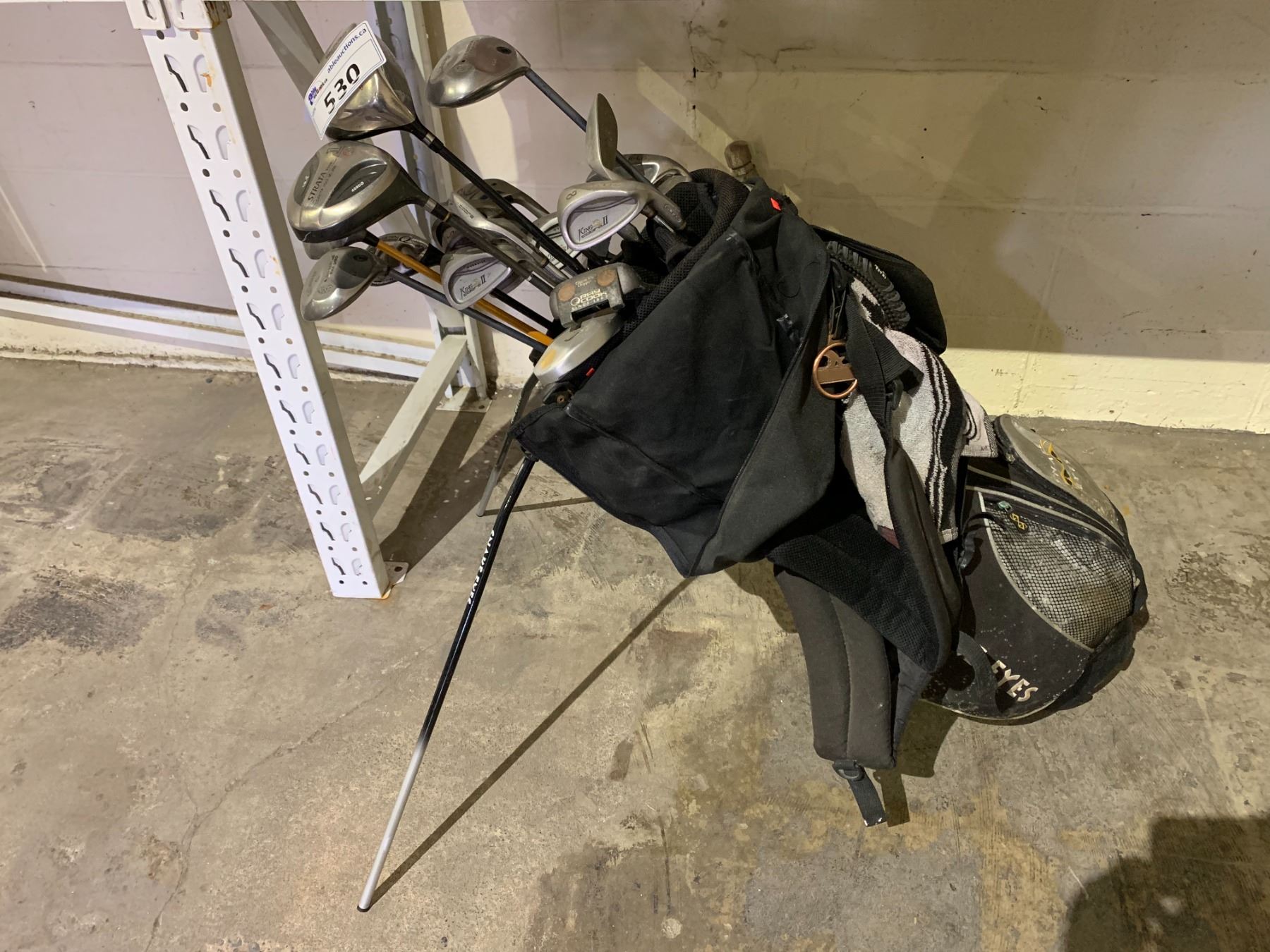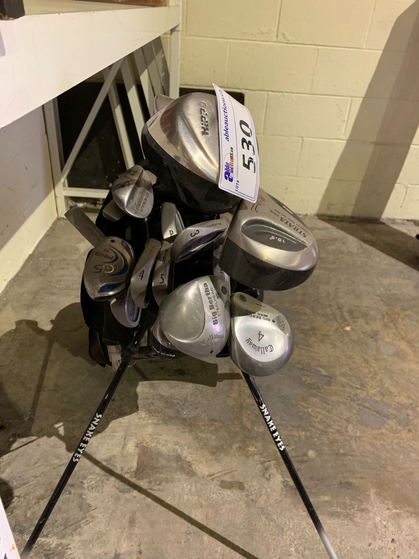 SNAKE EYES GOLF CADDY WITH ASSORTED CLUBS; STRATA TOUR, CALLAWAY, HIPPO, RAY COOK AND MORE