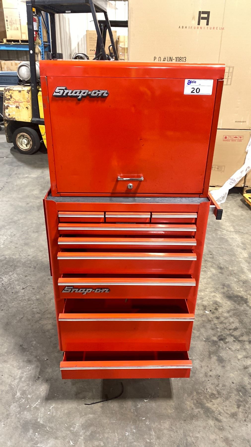 SNAP-ON RED 9 DRAWER MOBILE BOTTOM TOOL CHEST WITH SIDE TOOL TRAY & SNAP-ON RED 12 DRAWER TOP TOOL CHEST WITH KEYS
