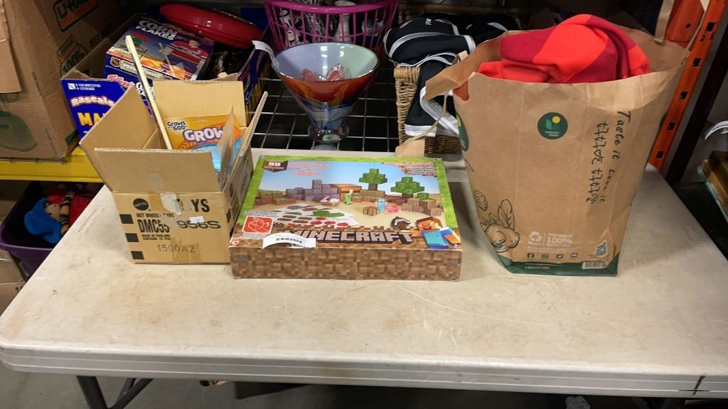 SNORLAX VMAX GIANT POKEMON CARD, MINECRAFT PAPER CRAFT SET, GROW DINOSAUR, MINI HOCKEY STICK AND KIDS CLOTHES, PUMA PANTS