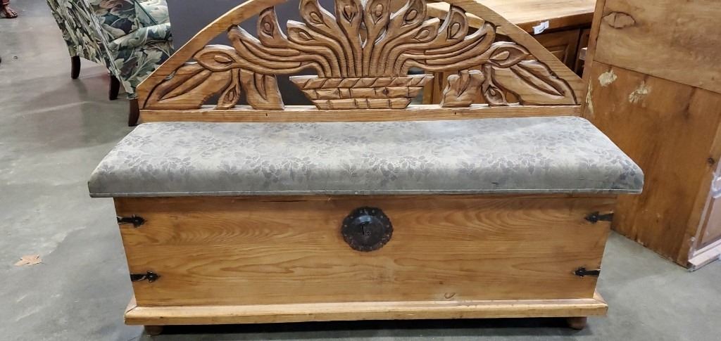 SOLID PINE REPRODUCTION HAND CARVED STORAGE BENCH