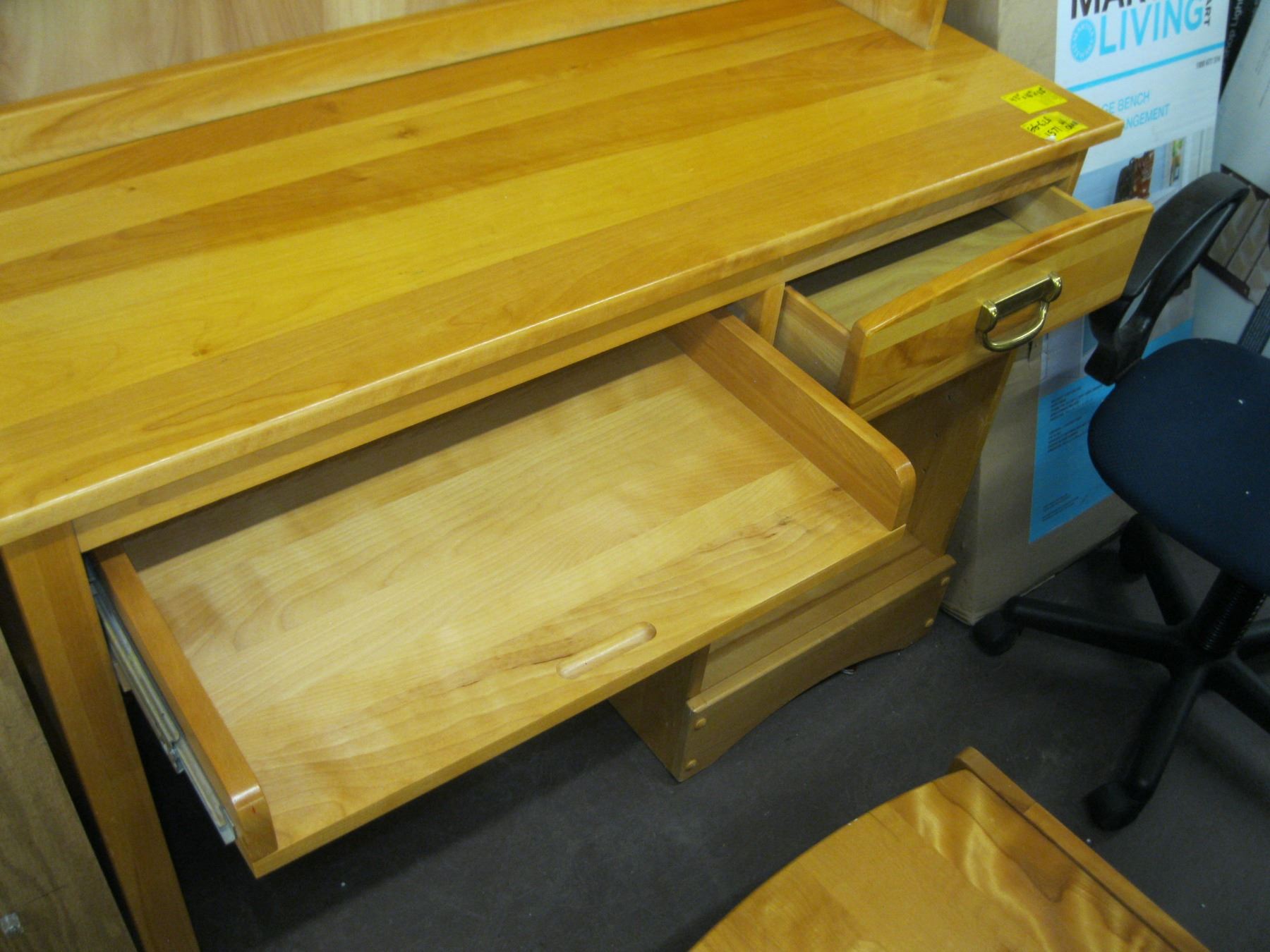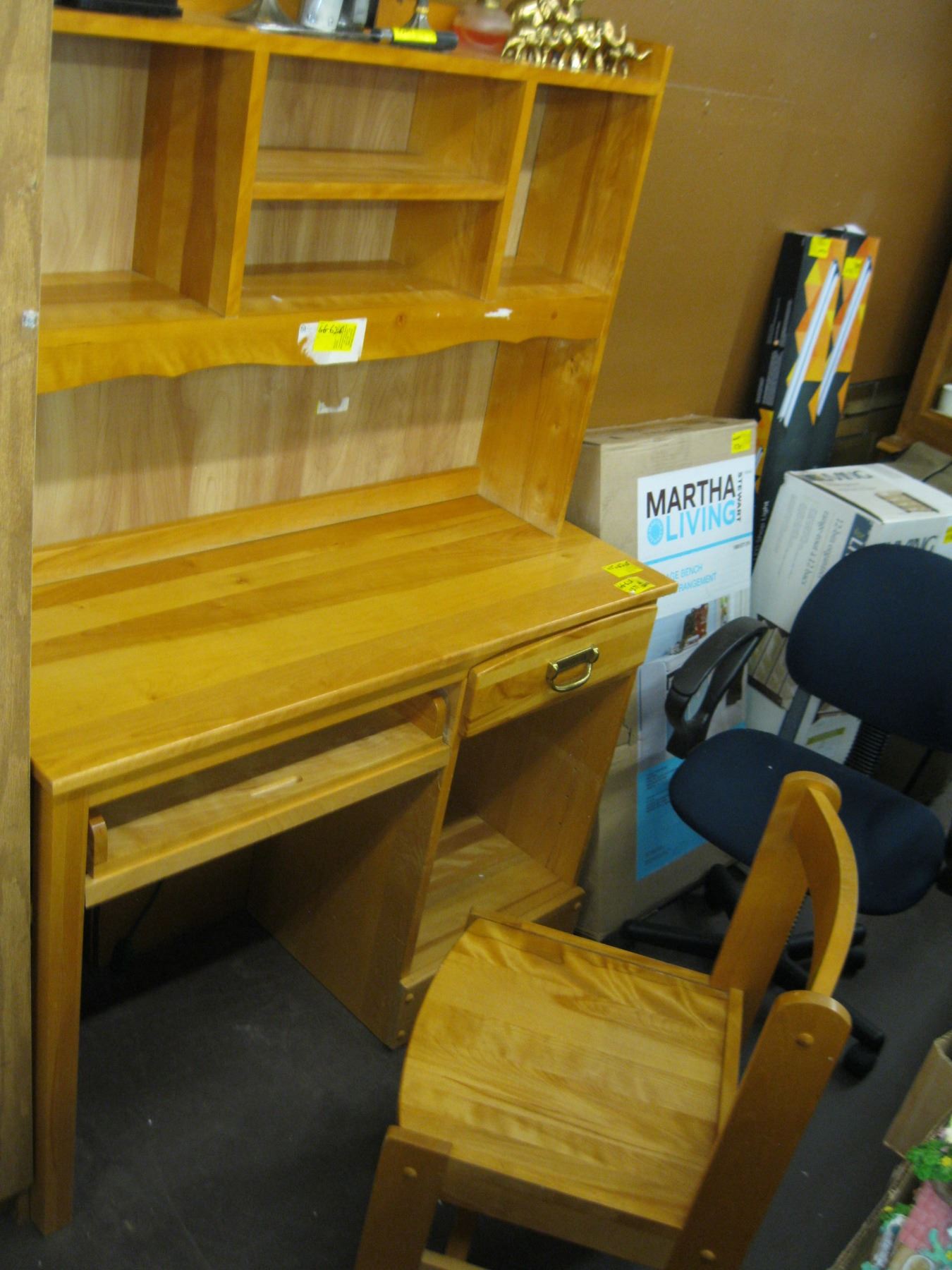 SOLID WOOD DESK WITH CHAIR AND HUTCH.