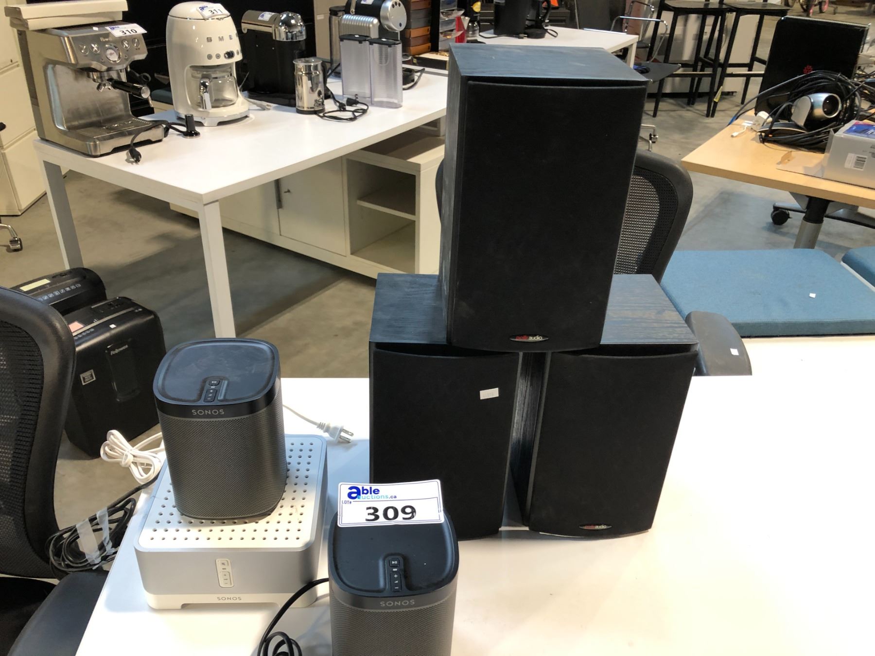 SONOS SPEAKER SYSTEM AND 3 POLK AUDIO SPEAKERS T15