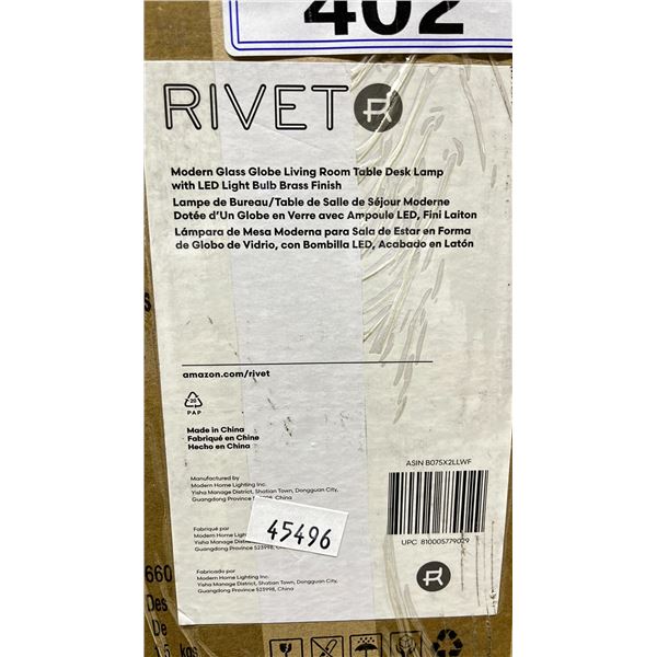 LOT OF 2 RIVET MODERN GLASS GLOBE LIVING ROOM TABLE DESK LAMP WITH LED LIGHT BULB BRASS FINISH402 - LOT OF 2 RIVET MODERN GLASS GLOBE LIVING ROOM TABLE DESK LAMP WITH LED LIGHT BULB BRASS FINISH