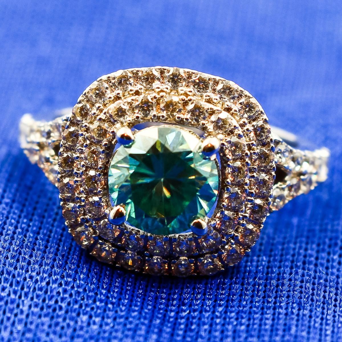 SPARKLING 2.5 CT MINT GREEN DIAMOND RING. THIS LAB CREATED DIAMOND IS A VVS1 BRILLIANT ROUND CUT. MOISSANITE IS THE WORLD'S MOST BRILLIANT GEM. WITH A REFRACTIVE INDEX OFf 2.65-2.69, MOISSANITE EXHIBITS MORE BRILLIANCE THAN A DIAMOND. AND THANKS TO A DISPERTION THAT'S 2.4 TIMES HIGHER THAN A DIAMOND, MOISANITE BENDS LIGHT INTO MESMERIZING RAINBOW ELECTRIC FLASHES OF FIRE... MORE THAN "TWICE " AS MUCH AS A DIAMOND. BY DAY AND BY NIGHT MOISANITES LEGENDARY BRILLANCE IS SPECTACULAR.THIS LAB DIAMOND WILL TEST POSITIVE FOR A DIAMOND ON ANY DIAMOND TESTER.NEAR FLAWLESS AND READY TO MOUNT. THE TOTAL GRAM WT IS 3.8 GRAMS. SIZE 7 1/2.