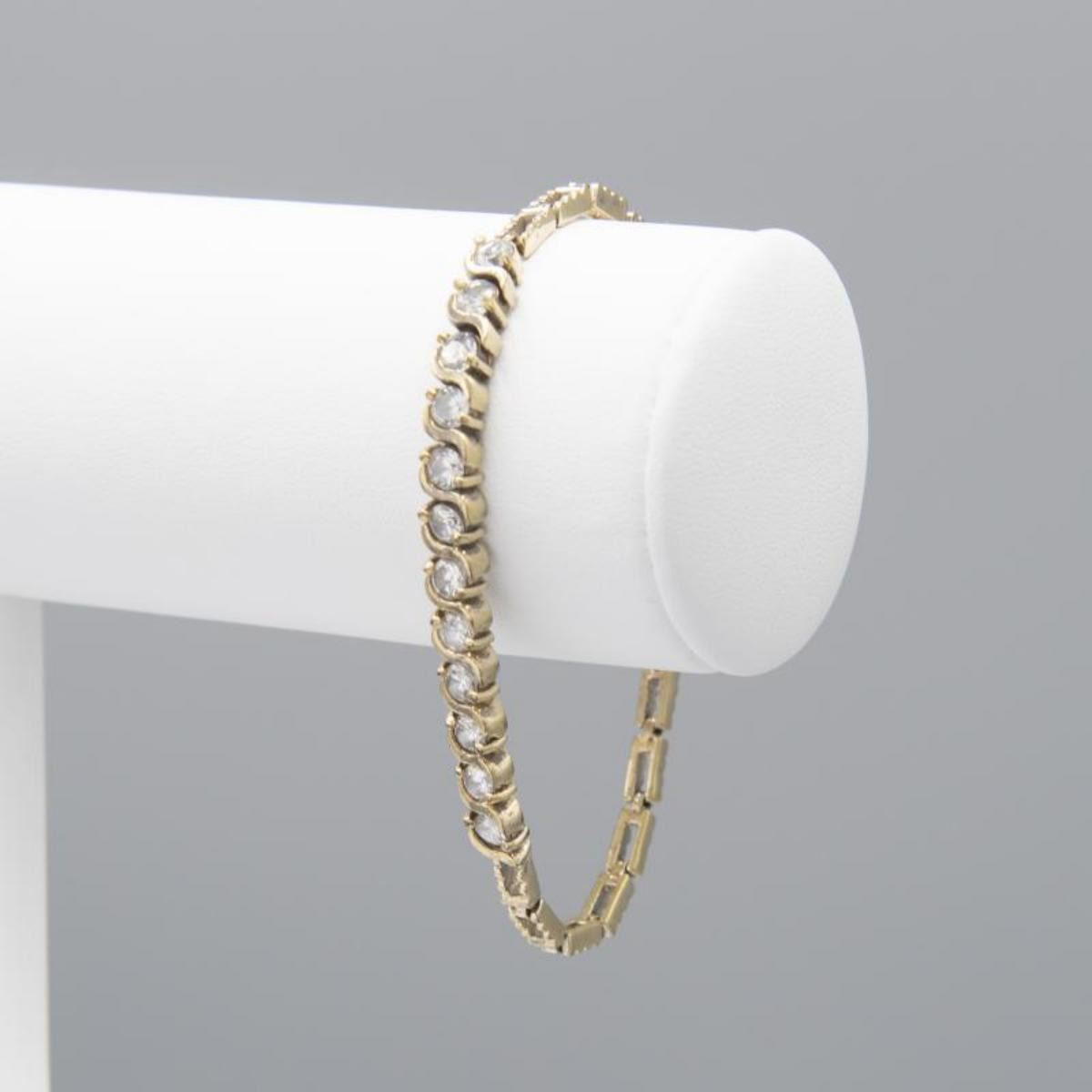 SPARKLING 4.5 Ct WHITE DIAMOND TENNIS BRACELET. These lab created diamonds are eye clean mounted in 14 Kt yellow gold overlayed on stamped .925 sterling silver. Approx 8" longand 60 Cttw or 12 Total Grams.Don't miss this one.