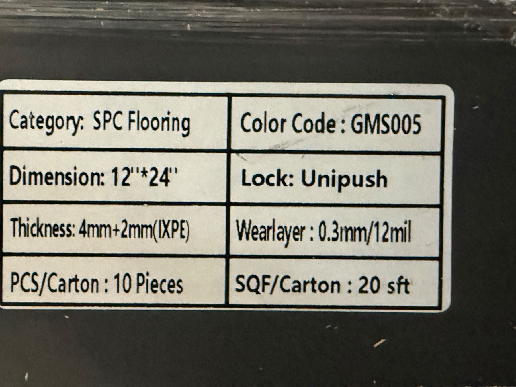 SPC Flooring - Colour: GMGS005 - Size: 12in x 24in x 10mm - Total sqf: 1200 - 60 boxes - Thickness: 4mm/Wearlayer:0.3mm/Underlay Embossed: 2mm - Sq/box: 20 - Bidding by the Square Feet
