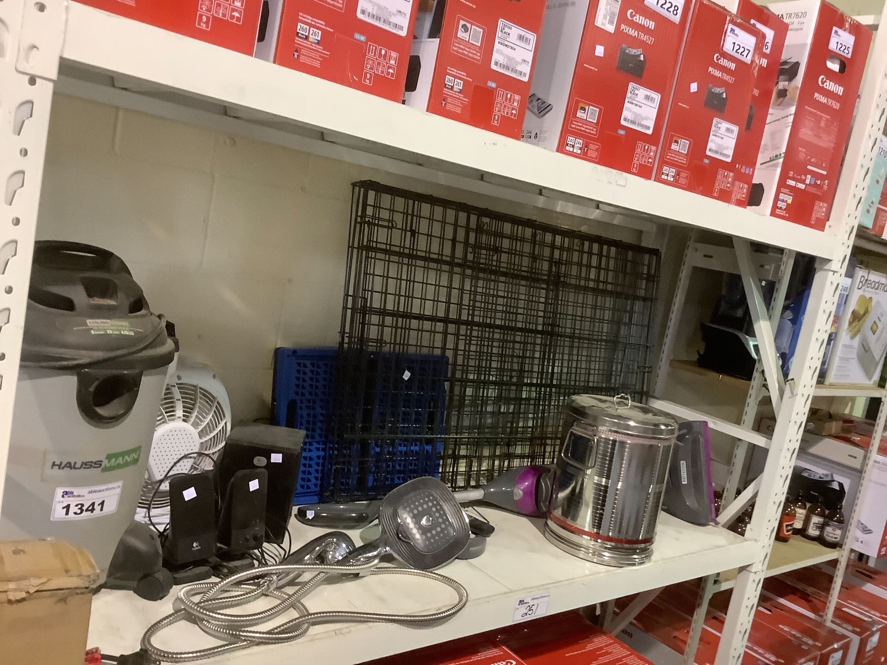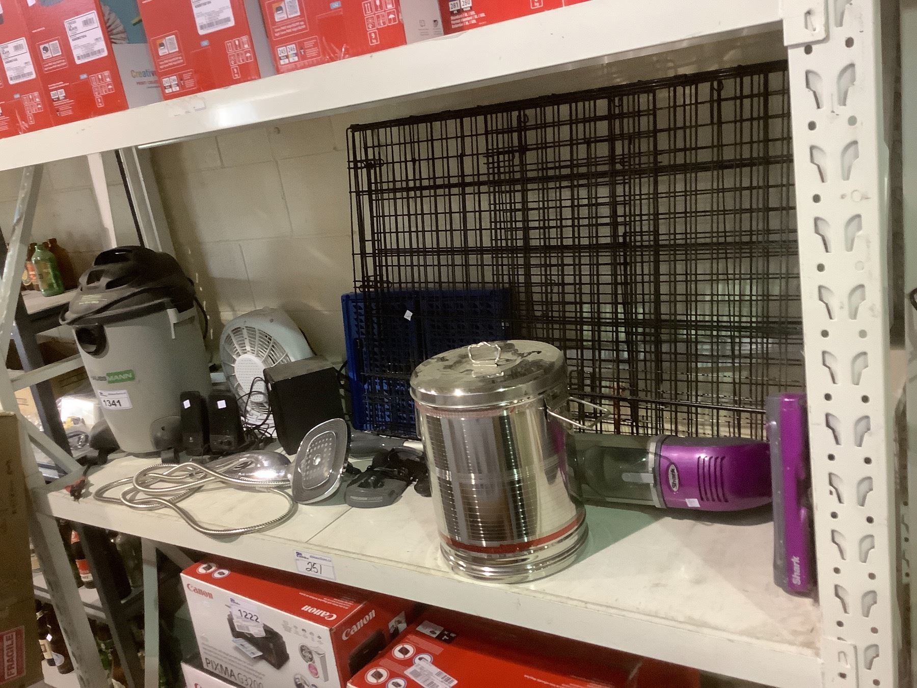 SPEAKERS, PET CRATE, FAN, HAUSSMANN SHOP VAC NO HOSE, SHARK ROTATOR VAC, PRESSURE COOKING POT, ETC
