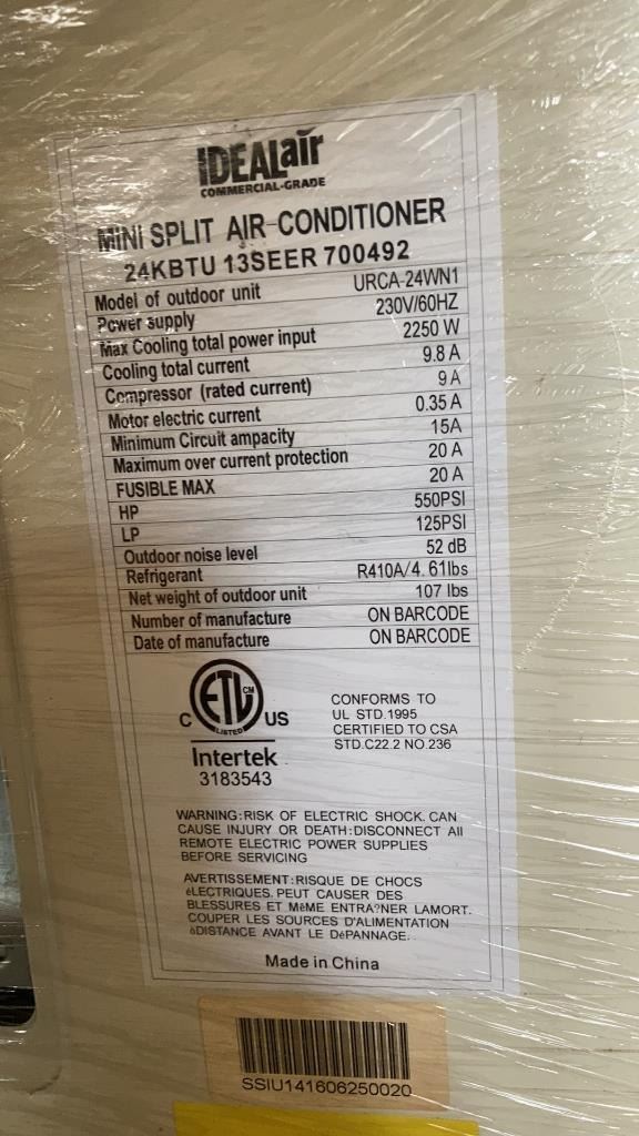 SPLIT TYPE AIR CONDITIONING UNIT AU-036WU INDOOR UNIT AND URCA-24WN1 OUTDOOR UNIT 24,000 BTU, 220V