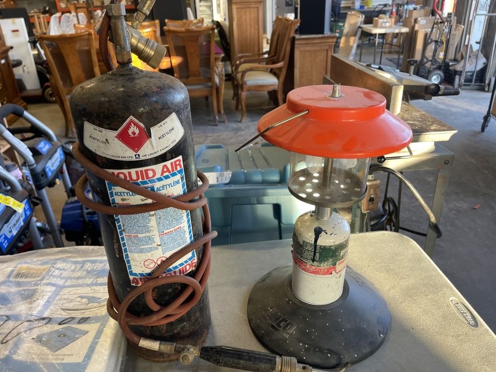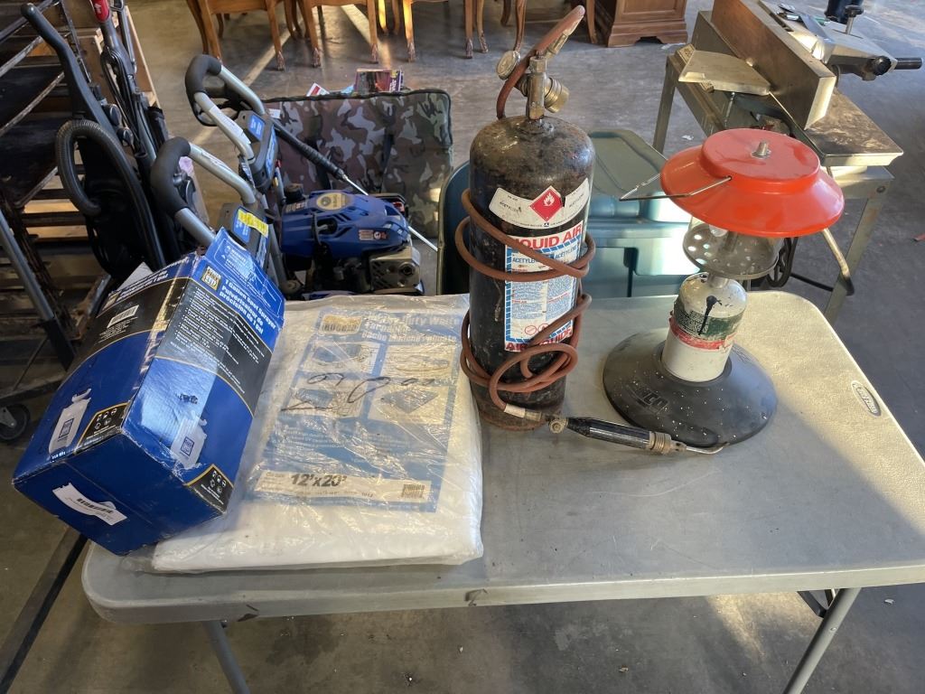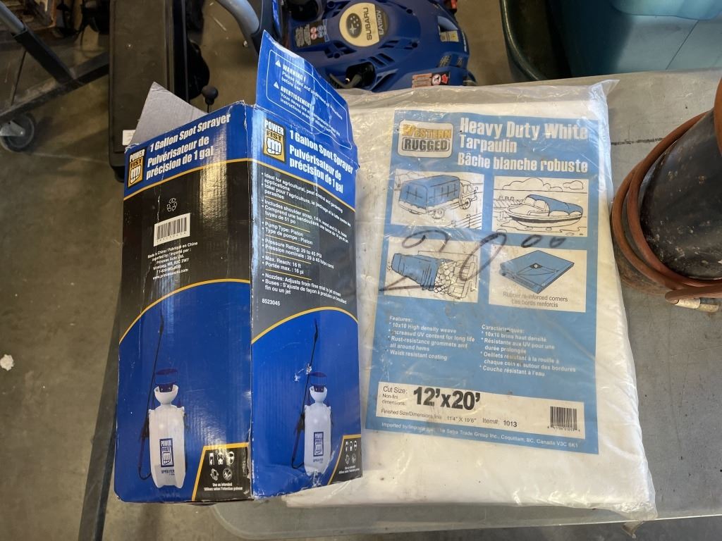 SPRAYER, TORCH, COLMAN LANTERN AND TARP