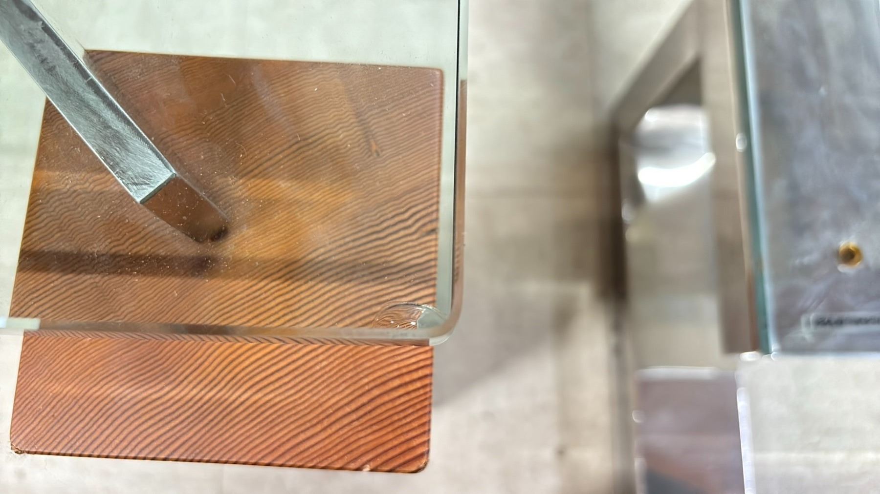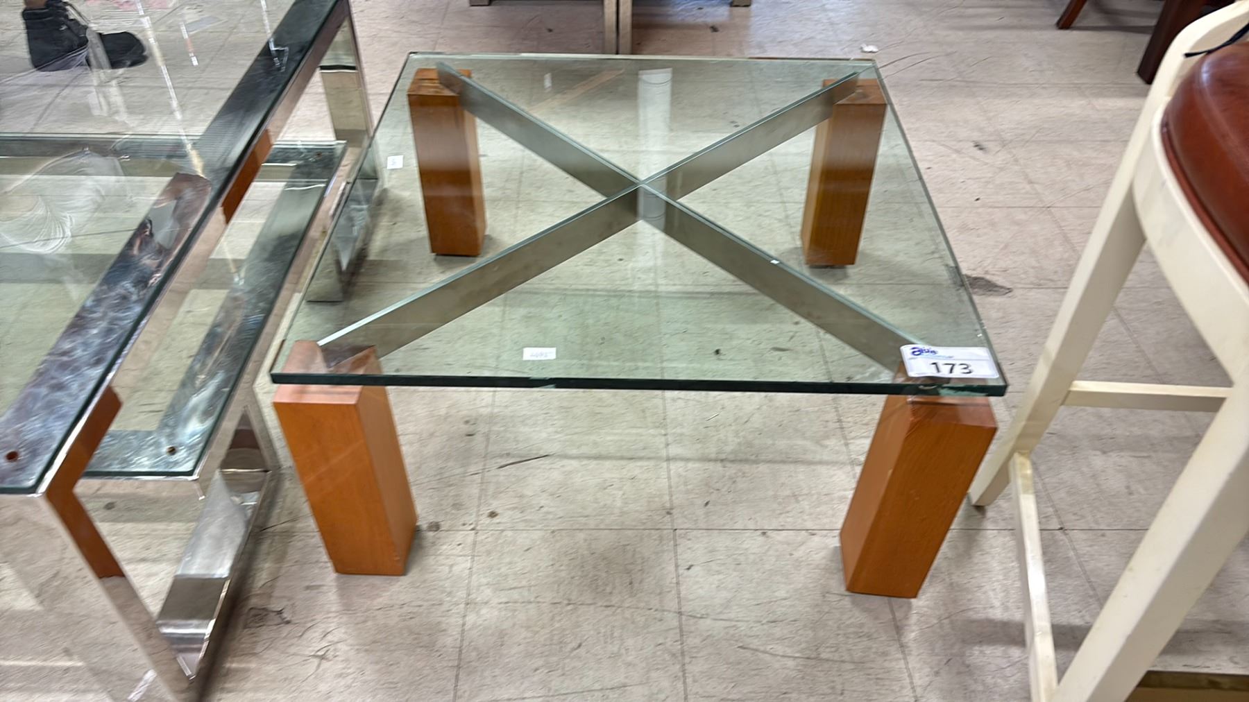 SQUARE TEMPERED GLASS COFFEE TABLE WITH WOODEN LEGS - 33.5"W X 33.5"D X 17"H *HAS A CHIP ON ONE EDGE*