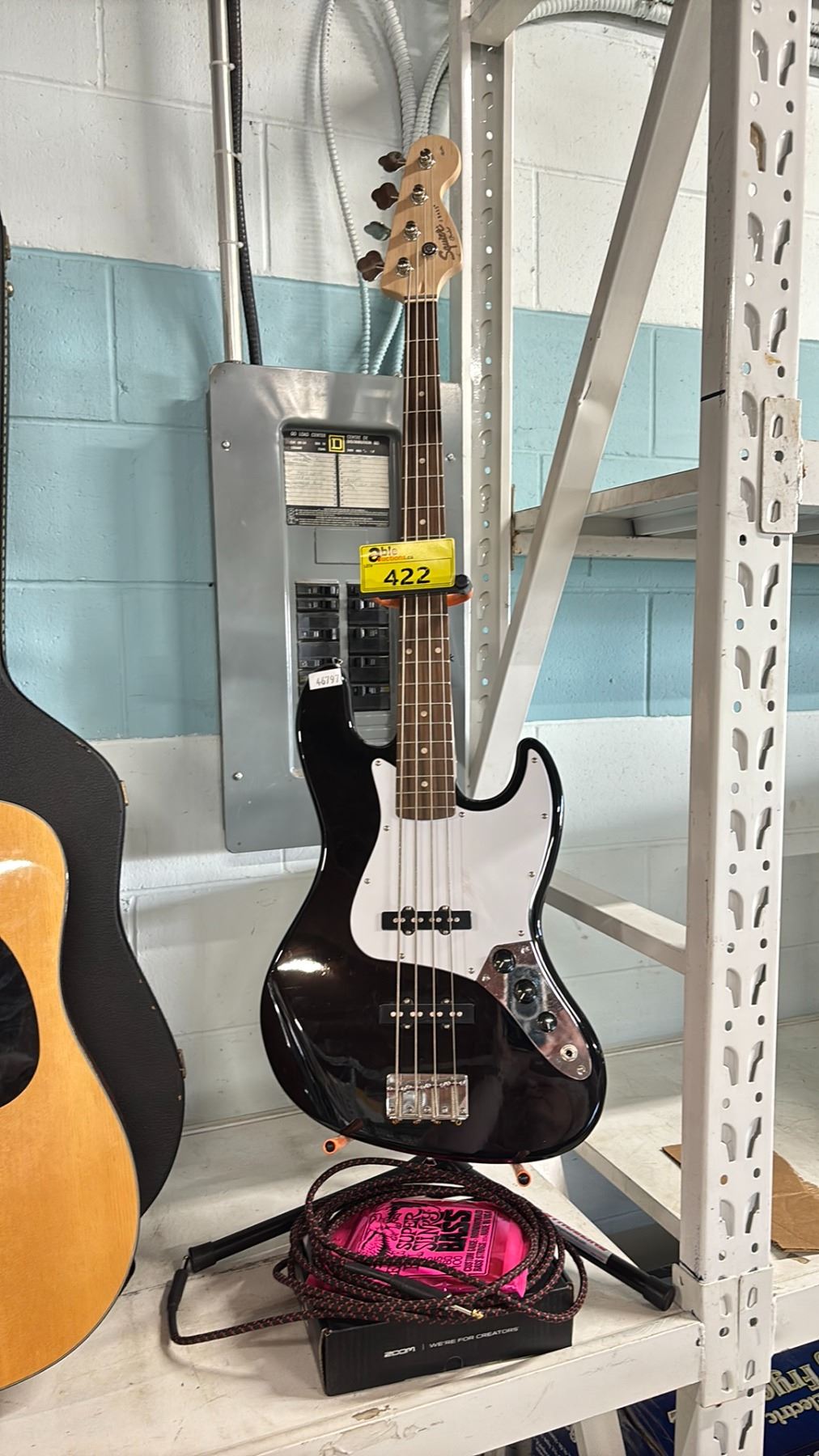 SQUIER J BASS ELECTRIC GUITAR WITH CASE, ZOOM B1 FOUR BASS MULTI-EFFECTS PROCESSOR, EXTRA GUITAR STRINGS & CABLE