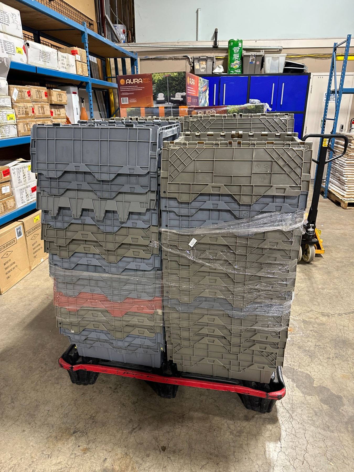 STACK OF 13 GREY PLASTIC 21"W X 15"D X 13"H INDUSTRIAL FOLD TOP STORAGE BINS