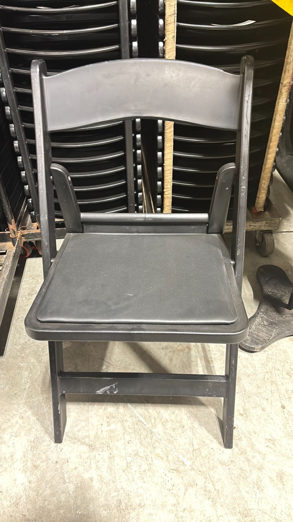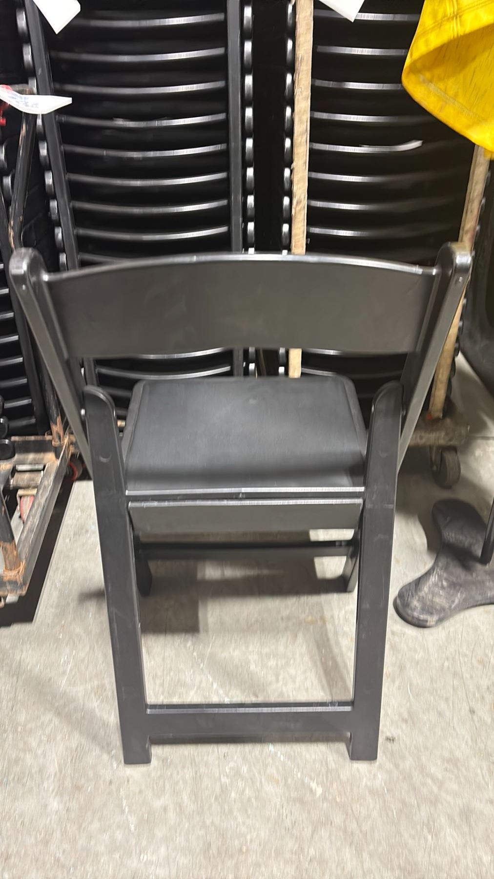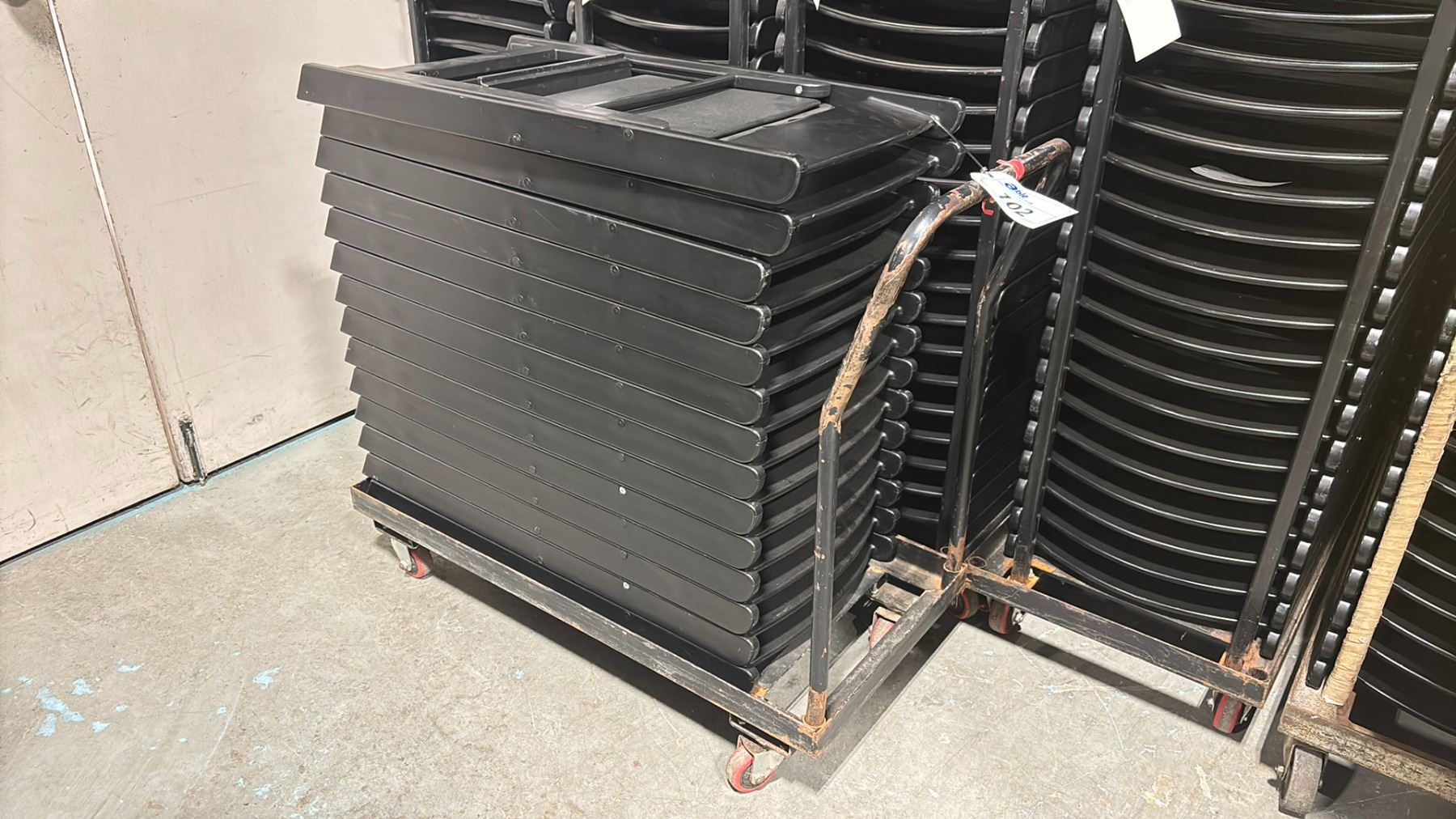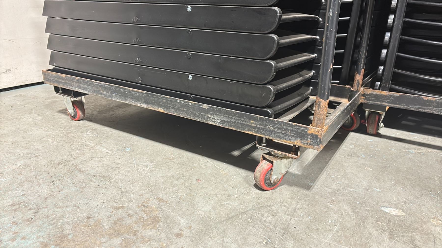 STACK OF 14 BLACK PLASTIC FOLDING EVENT CHAIRS ON MOBILE CHAIR CART * CART INCLUDED *