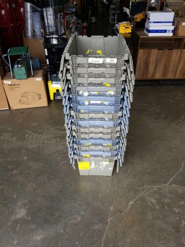STACK OF 15 TOTES WITH BUILT IN INTERLOCKING LIDS
