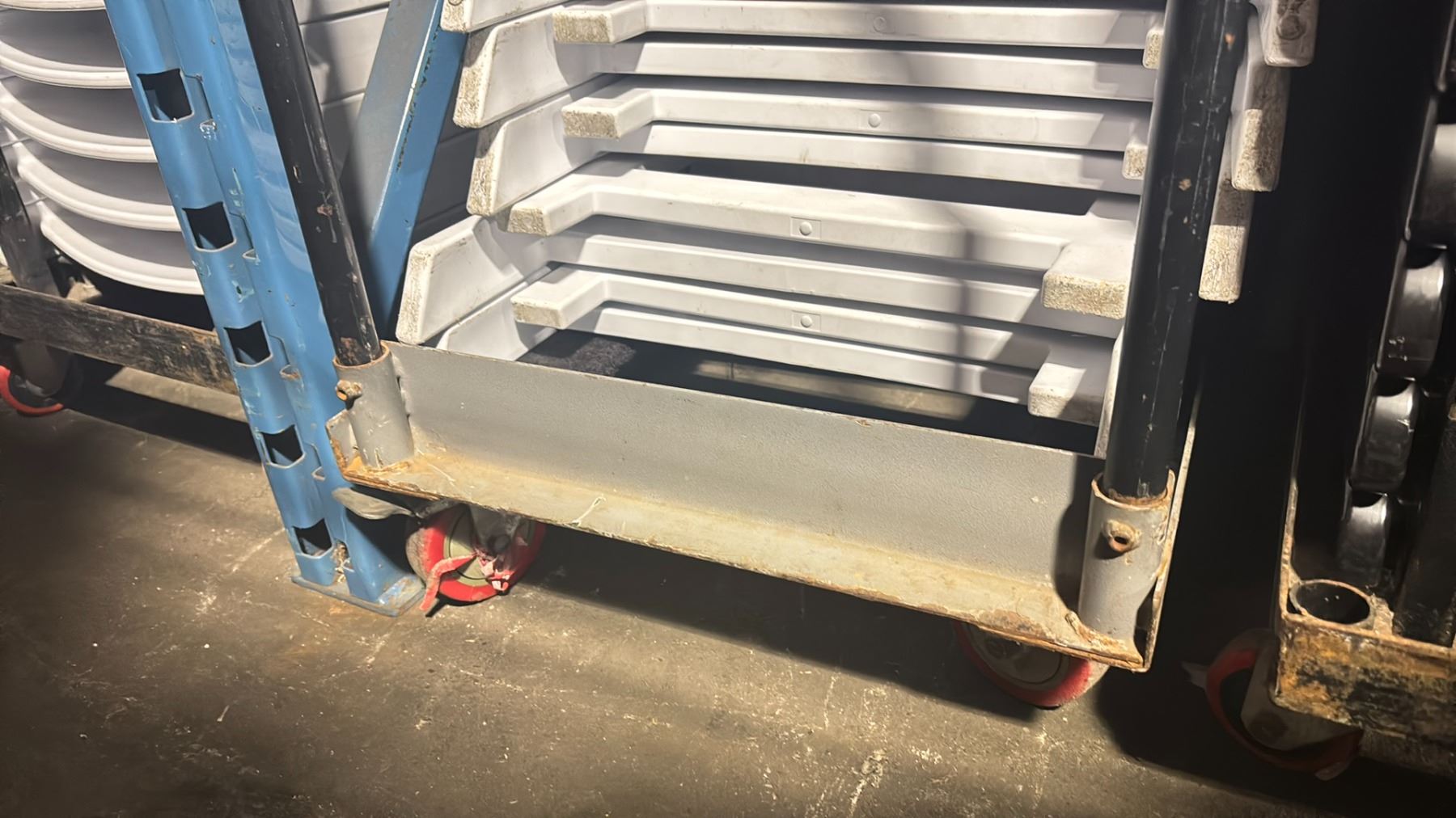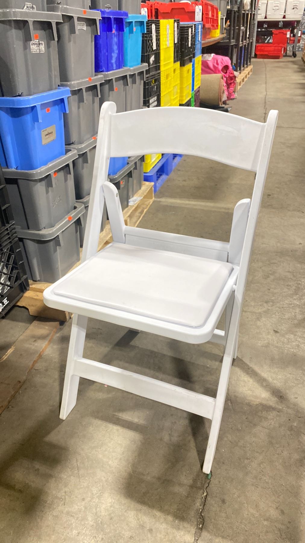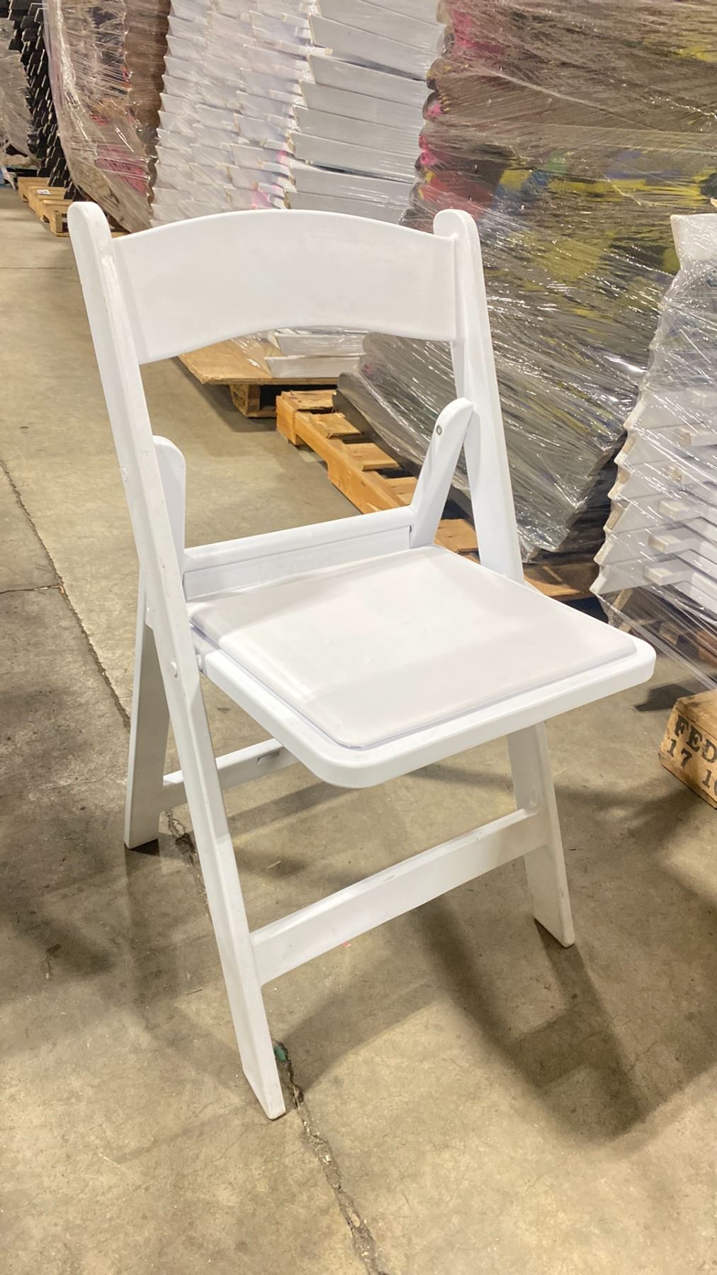 STACK OF 22 WHITE PLASTIC FOLDING EVENT CHAIRS ON MOBILE CHAIR CART *CART INCLUDED*