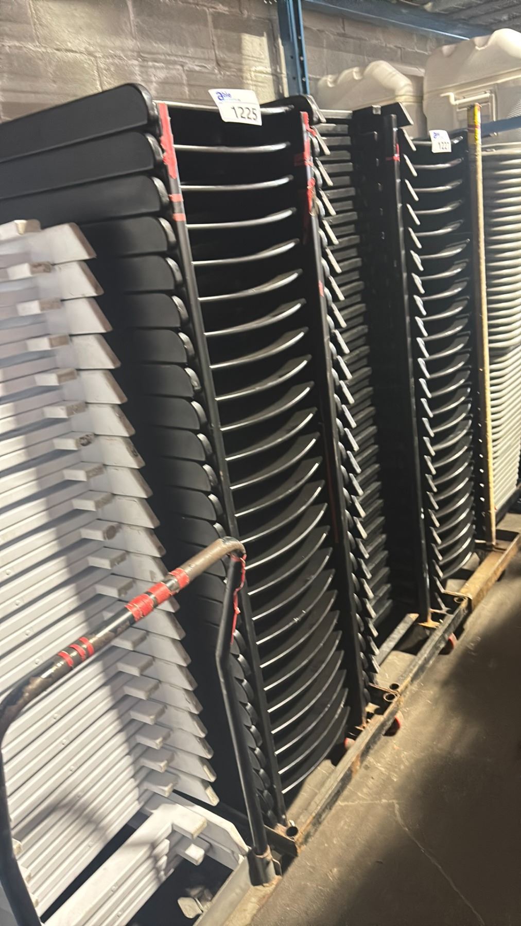 STACK OF 25 BLACK PLASTIC FOLDING EVENT CHAIRS ON MOBILE CHAIR CART *CART INCLUDED*