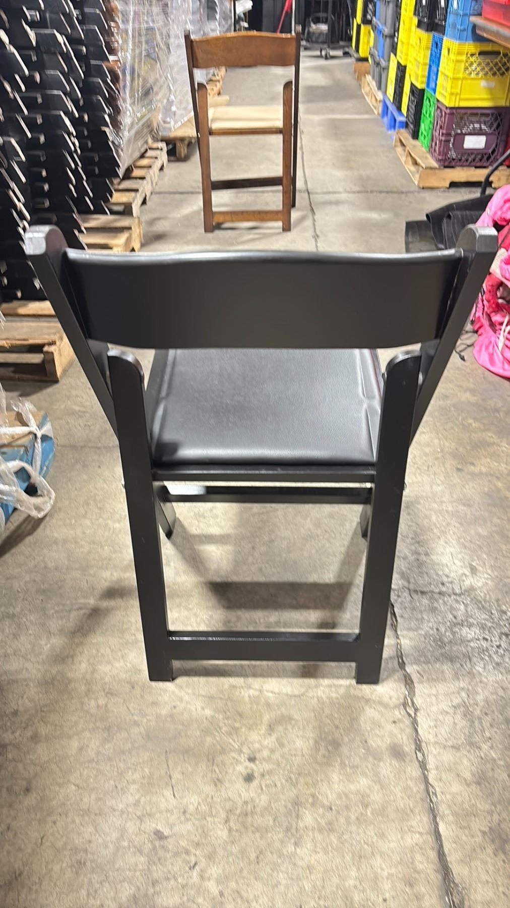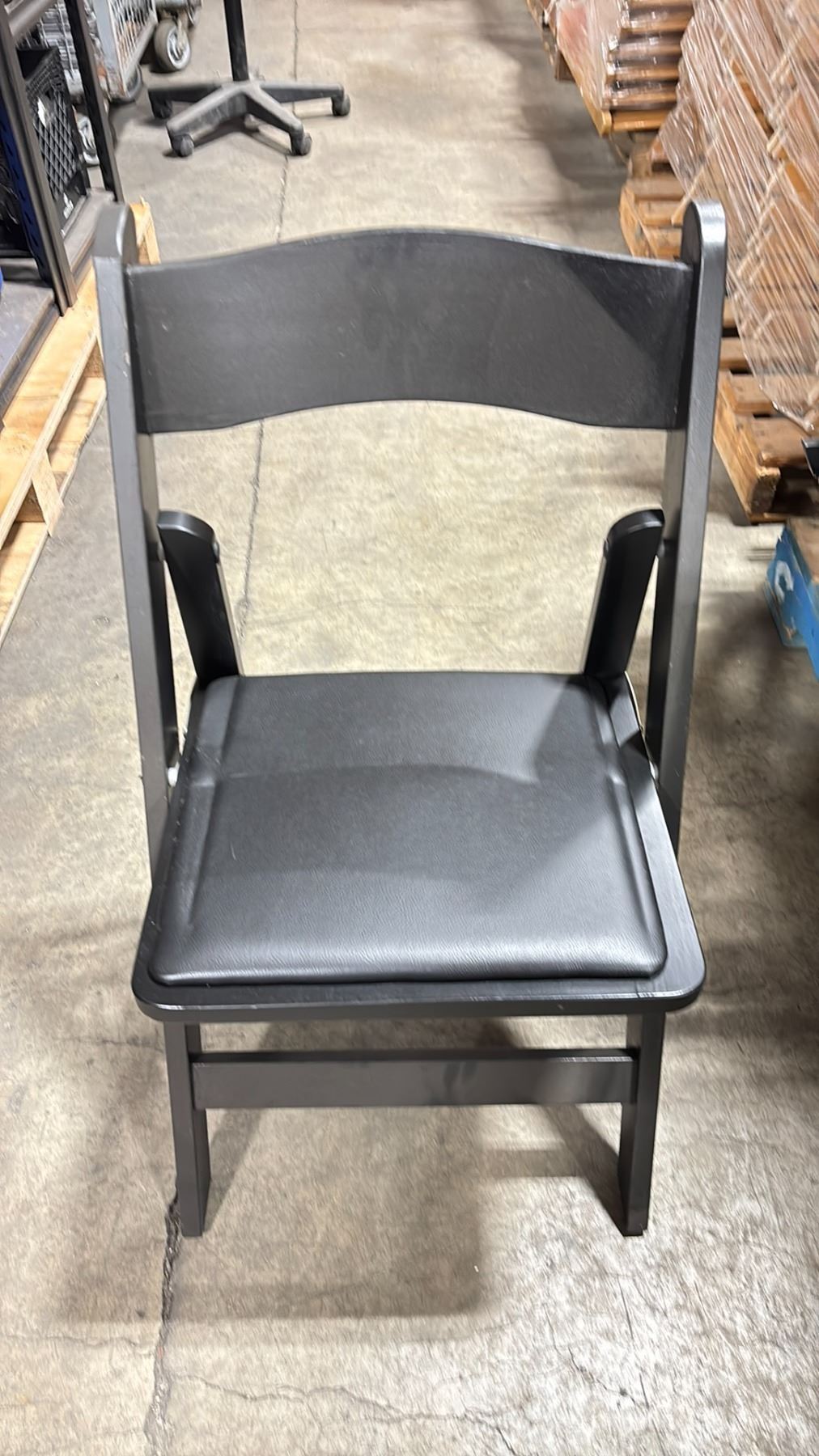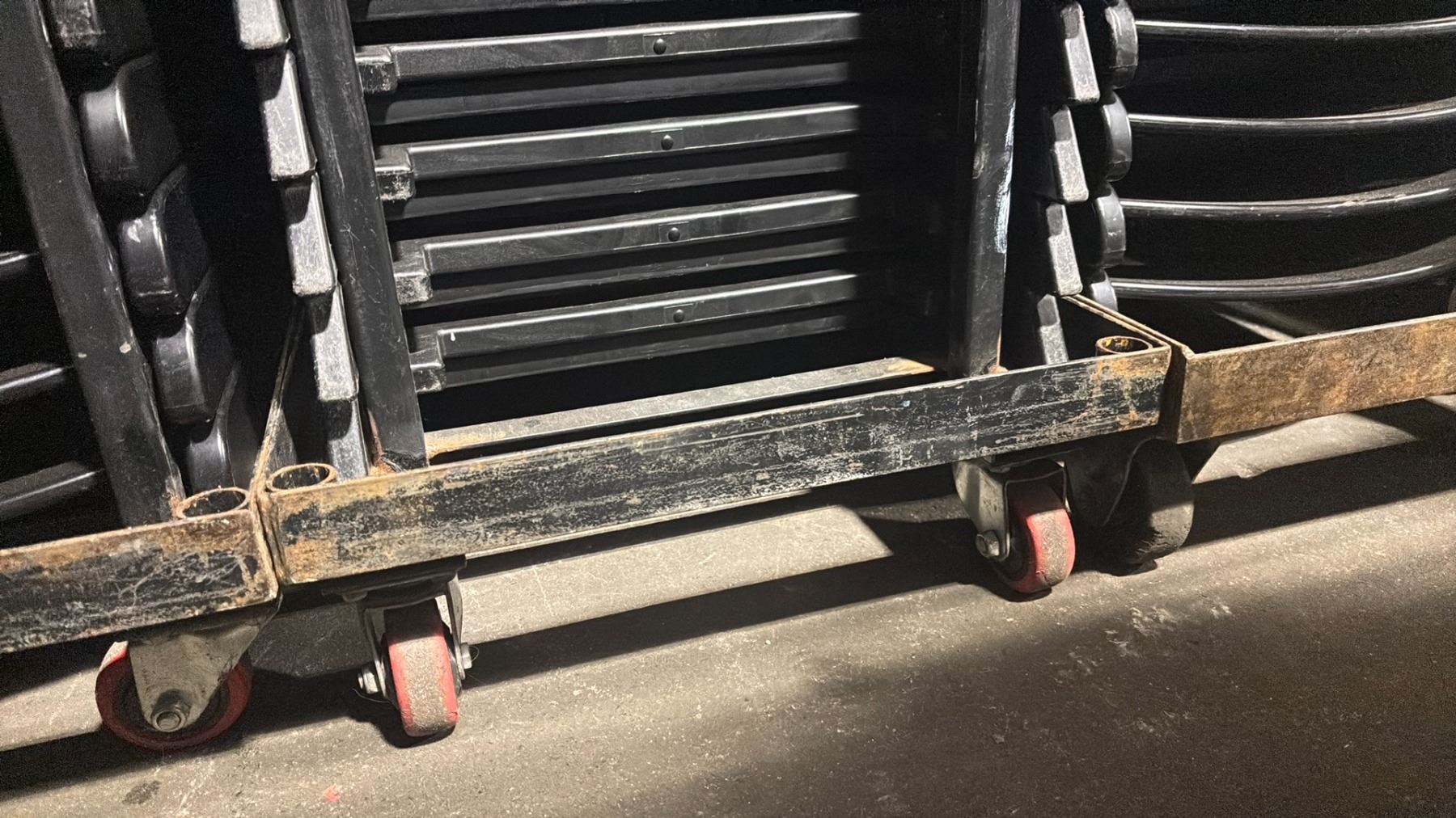 STACK OF 25 BLACK PLASTIC FOLDING EVENT CHAIRS ON MOBILE CHAIR CART *CART INCLUDED*