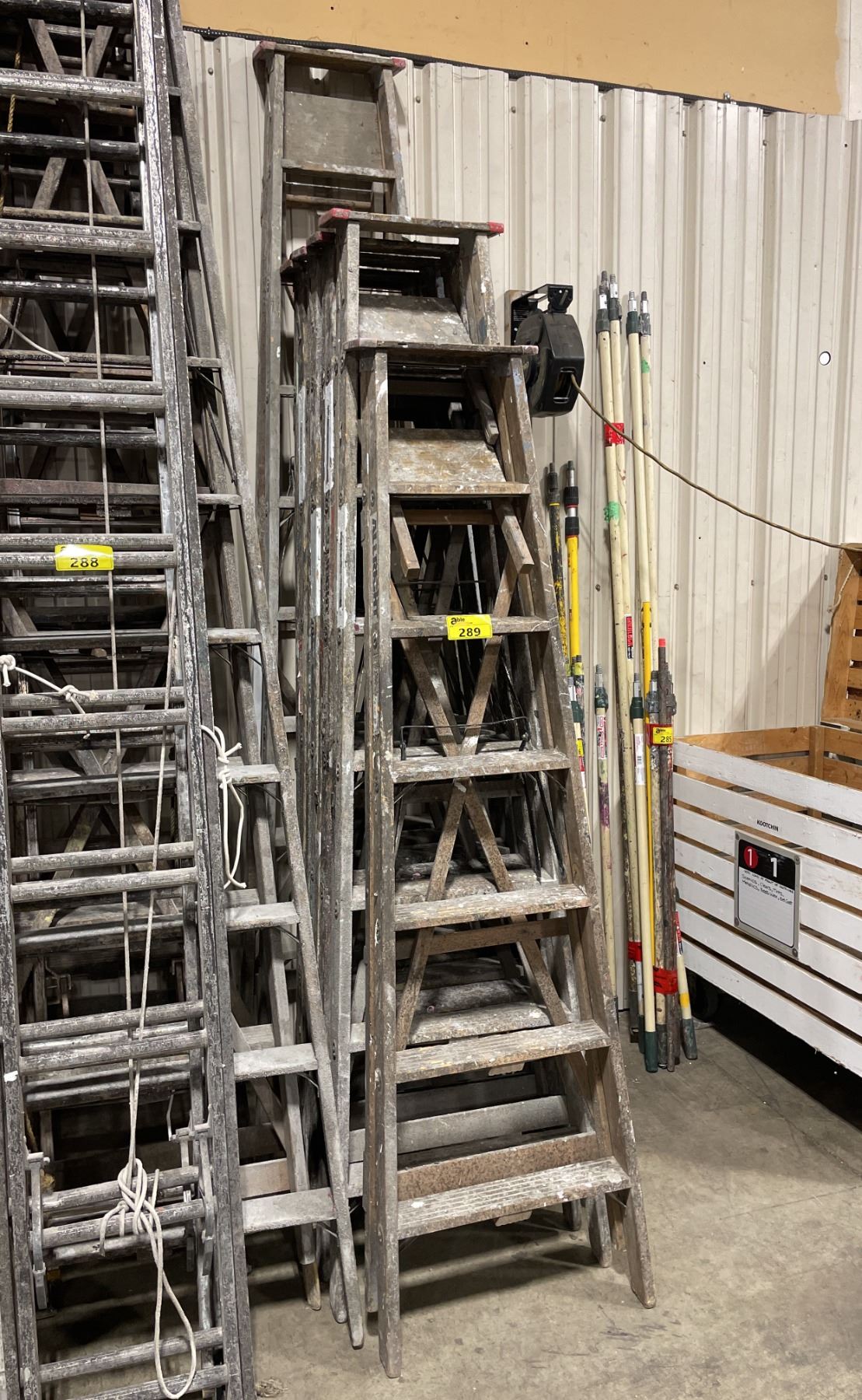 STACK OF 6 ASSORTED COMMERCIAL WOODEN STEP LADDERS *MUST TAKE ALL*