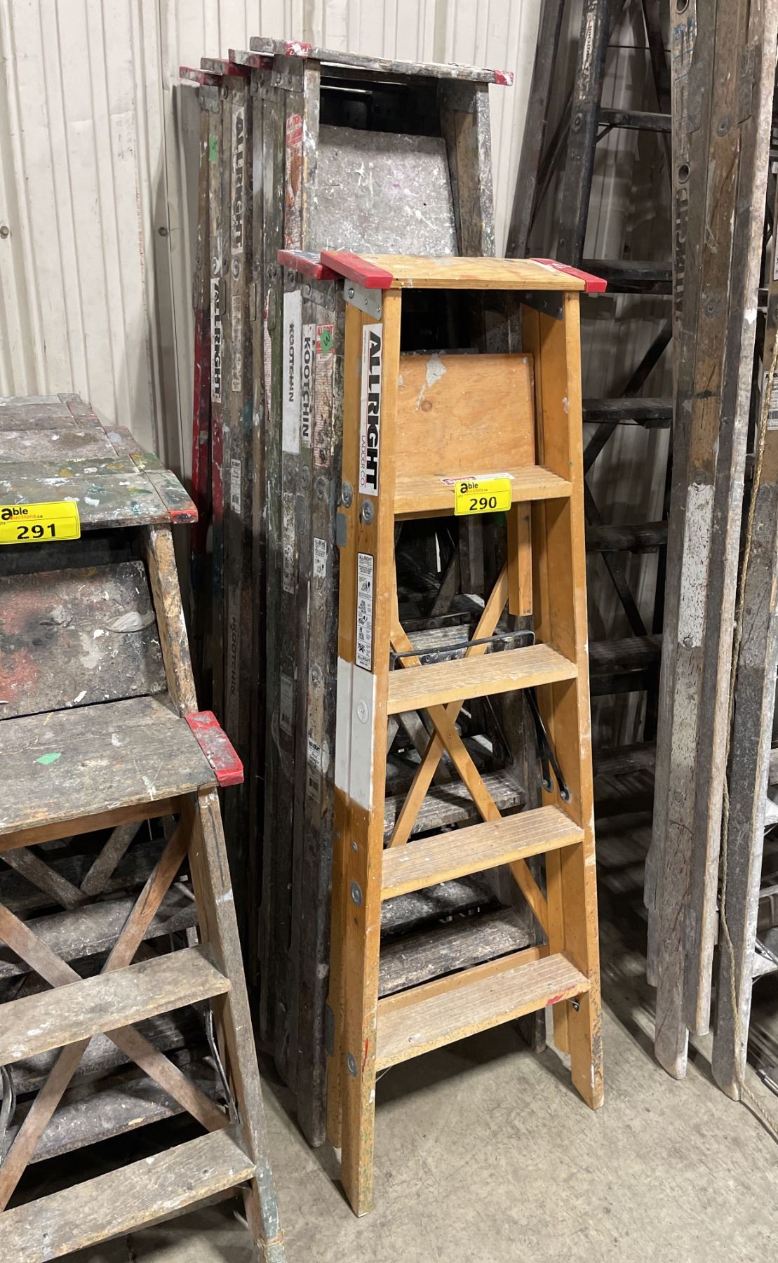STACK OF 6 ASSORTED COMMERCIAL WOODEN STEP LADDERS *MUST TAKE ALL*