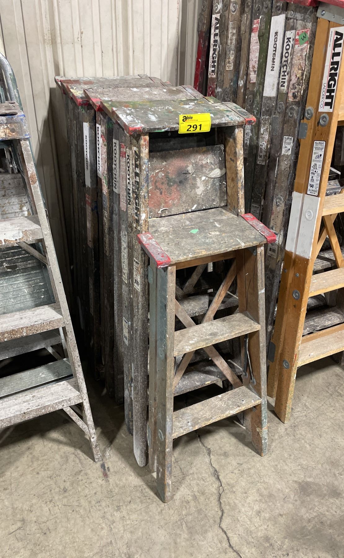 STACK OF 7 ASSORTED COMMERCIAL WOODEN STEP LADDERS *MUST TAKE ALL*