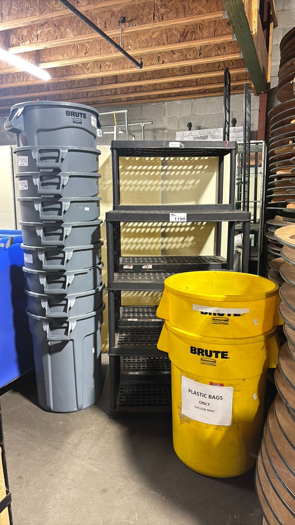 STACK OF 9 GREY RUBBERMAID BRUTE WASTE RECEPTACLES, 2 YELLOW BRUTE WASTE RECEPTACLES, & 2 BLACK PLASTIC ADJUSTABLE STORAGE SHELVING UNITS