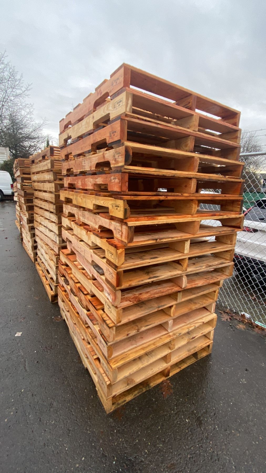 STACK OF APPROX 20 INDUSTRIAL WOODEN PALLETS